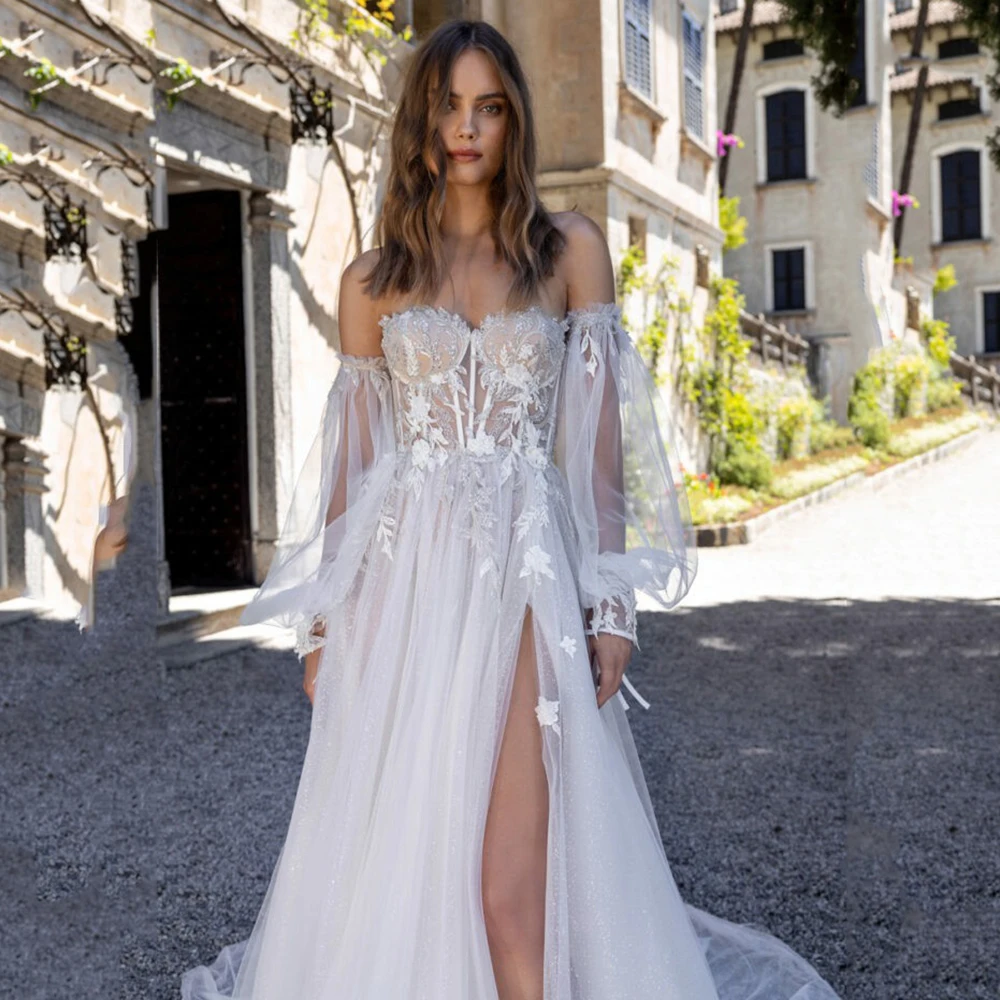UZN шикарное блестящее Тюлевое пляжное свадебное платье с длинным пышным рукавом, свадебные платья с бисером и аппликацией, платье для невесты