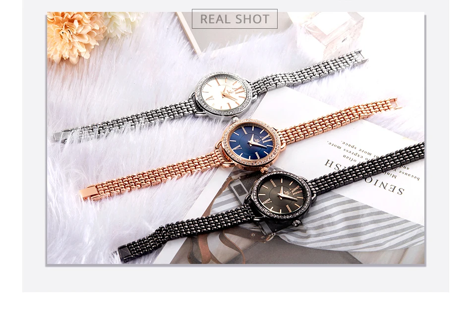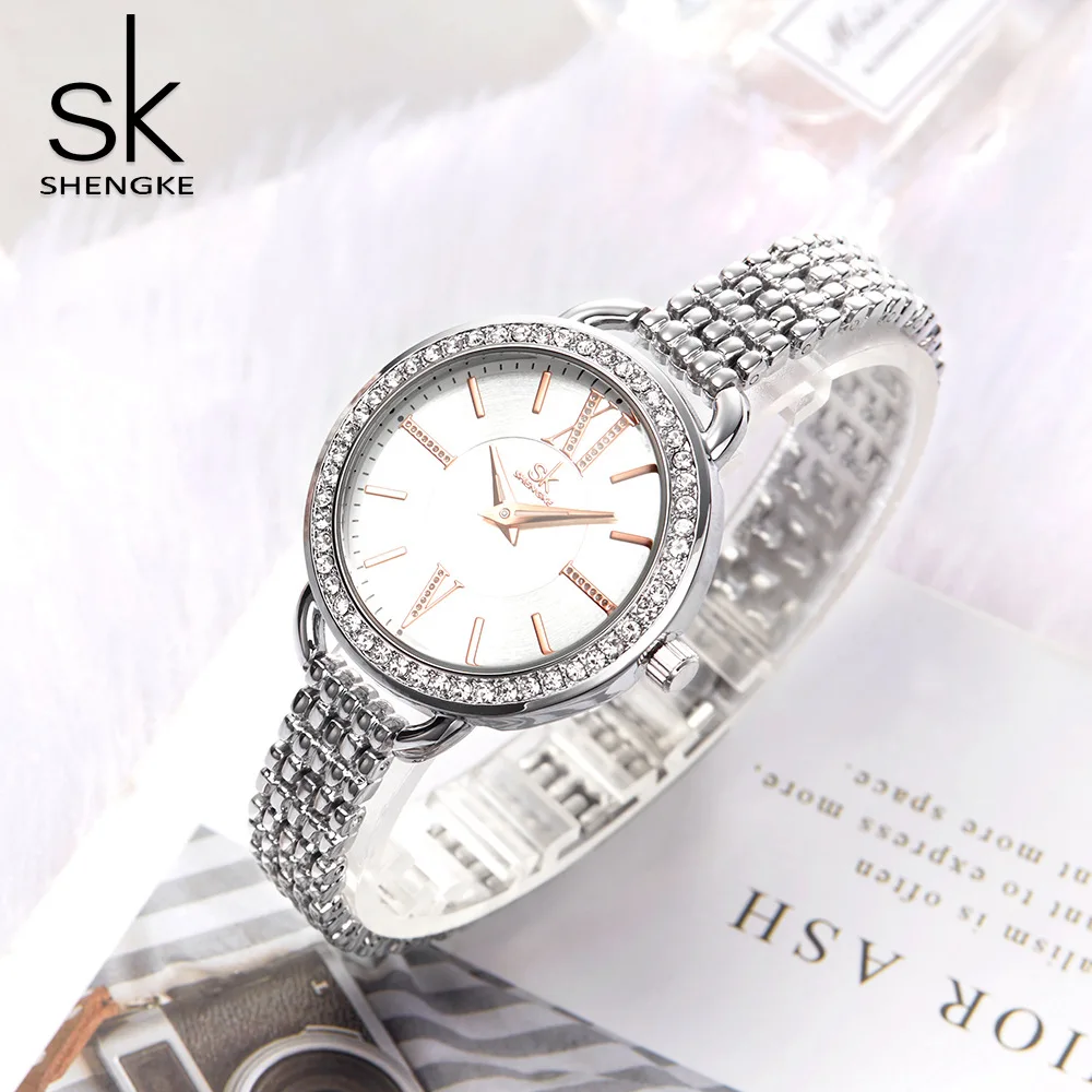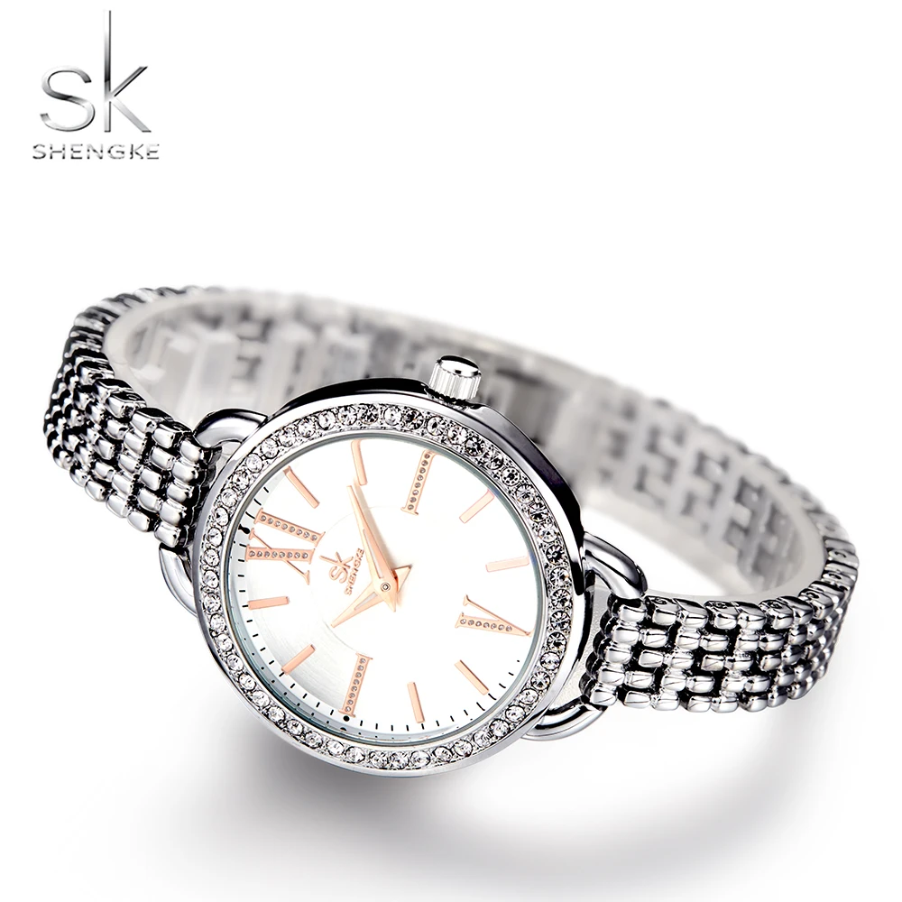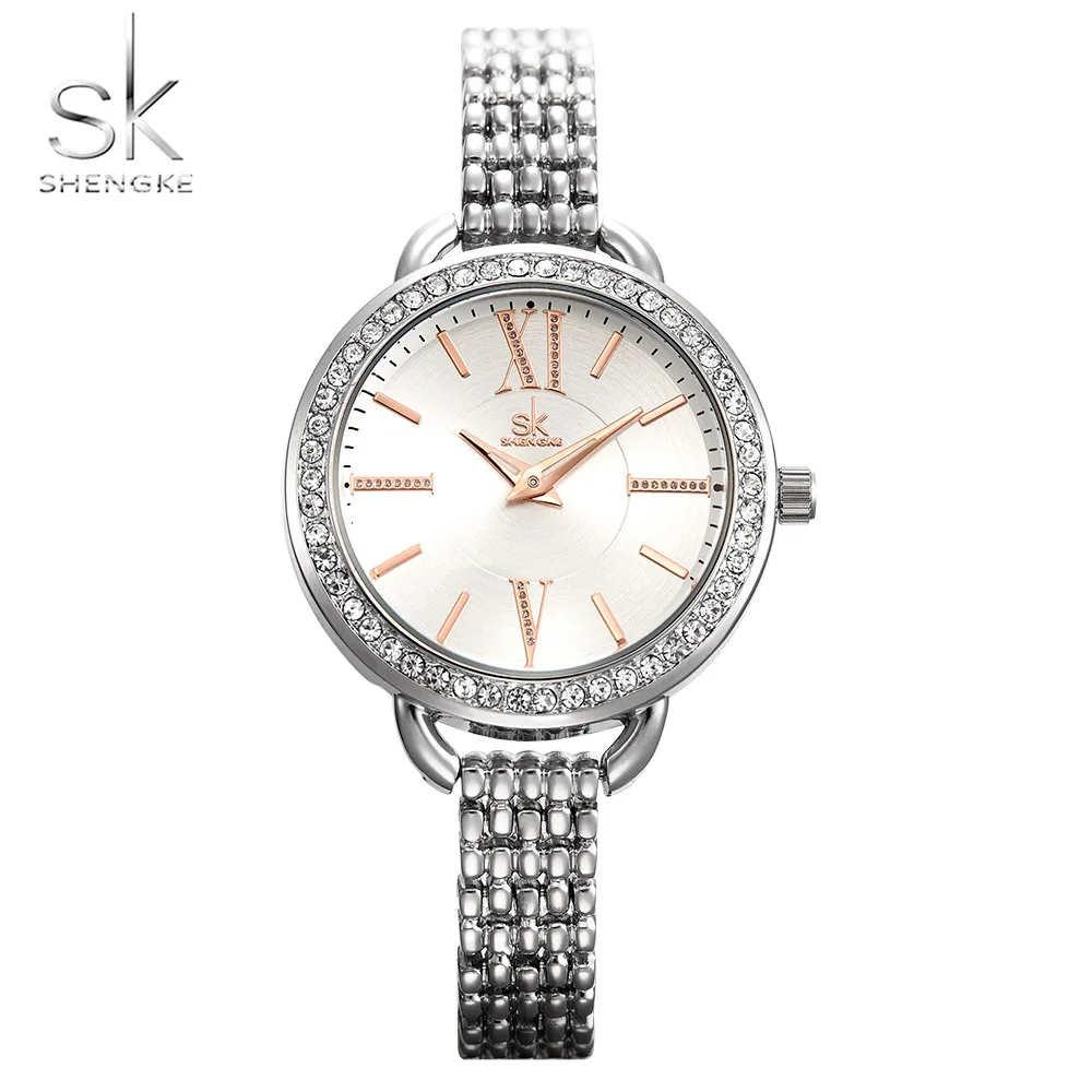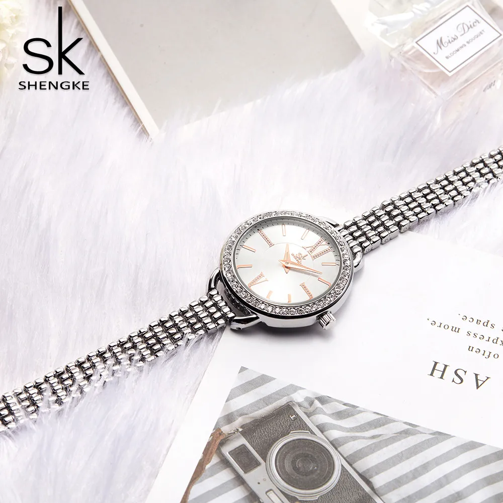 Часы Shengke женские с японским кварцевым механизмом, роскошные вечерние с браслетом, серебристые