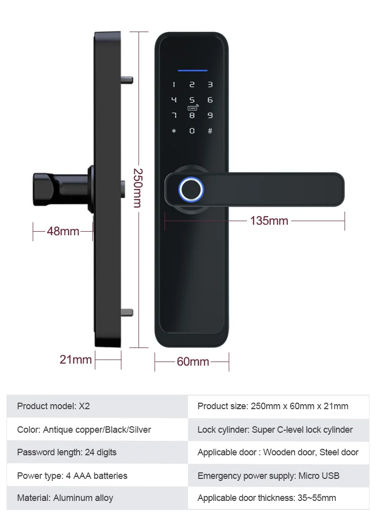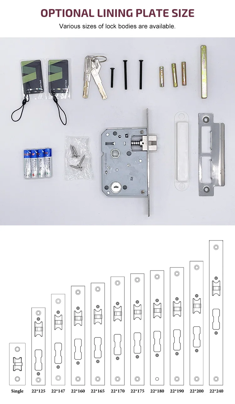 1. Приложение/отпечаток пальца/Пароль/смарт-карта/разблокировка ключа2. Просмотр журналов доступа из приложения3. Поддерживает обычный открытый режим (свободный доступ)4. Размер врезного замка5. Английский Голос6. Панель для волочения проволоки7. Матовый корпус8. Универсальные как для правой, так и для левой двери9. Подходит для 35-50 мм