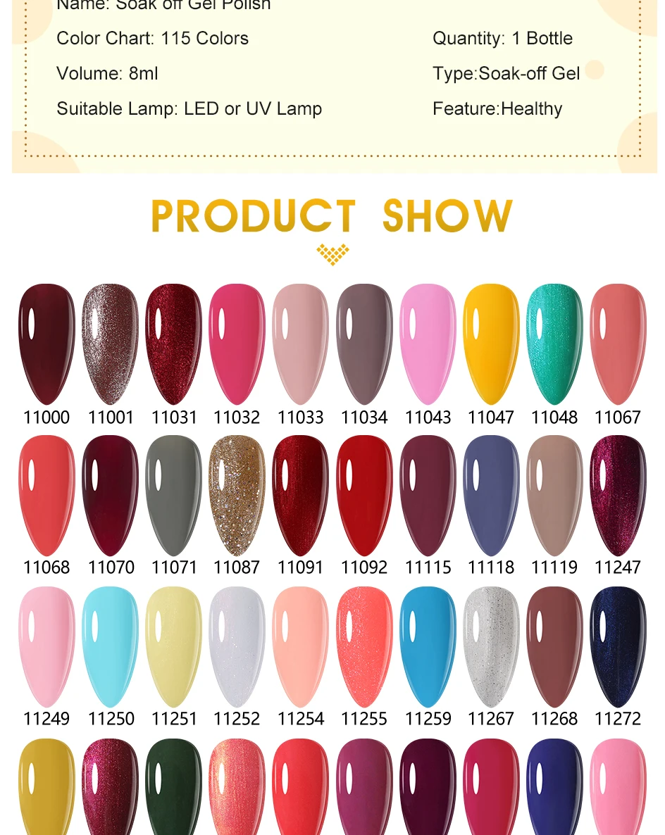 Инструкции по использованию:Шаг 1. Полностью встряхнуть флакон с лаком, это поможет сделать лак однородным. (Важно)Шаг 2. Сначала нанесите Базовое покрытие, что позволит лаку держаться дольше, просушите под УФ-лампой или LED-лампой. (Необходимо)Шаг 3. Нанесите лак непосредственно, вылечивайте УФ-лампой в течение 2-3 минут или вылечивайте светодиодной лампой в течение 60 секунд; При высыхании нанесите второй слой и вылечивайте УФ-лампой или светодиодной лампой снова.Шаг 4. Покройте смываемым финишным покрытием, которое сделает лак более блестящим, и высушите под УФ-лампой или LED-лампой.