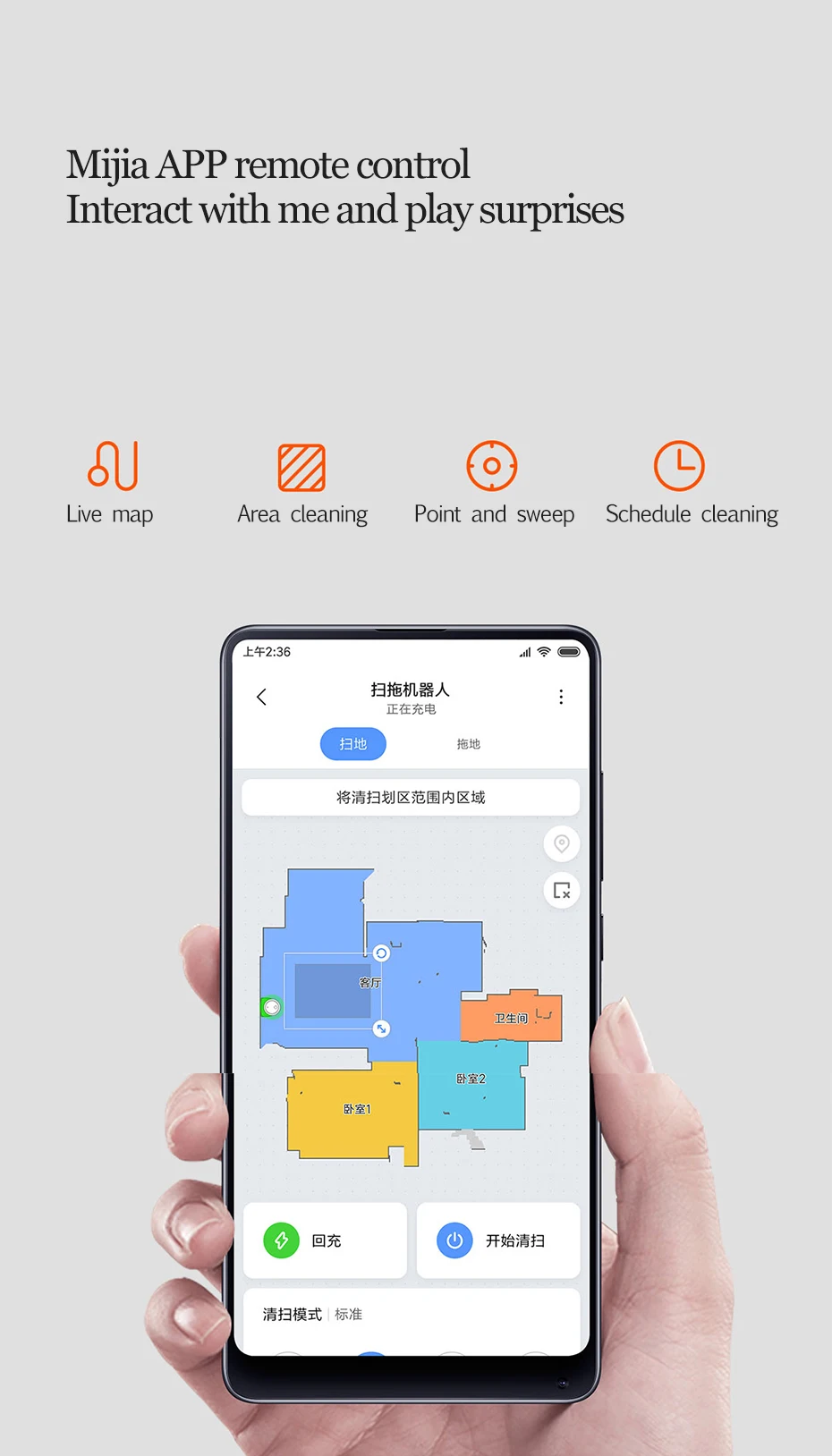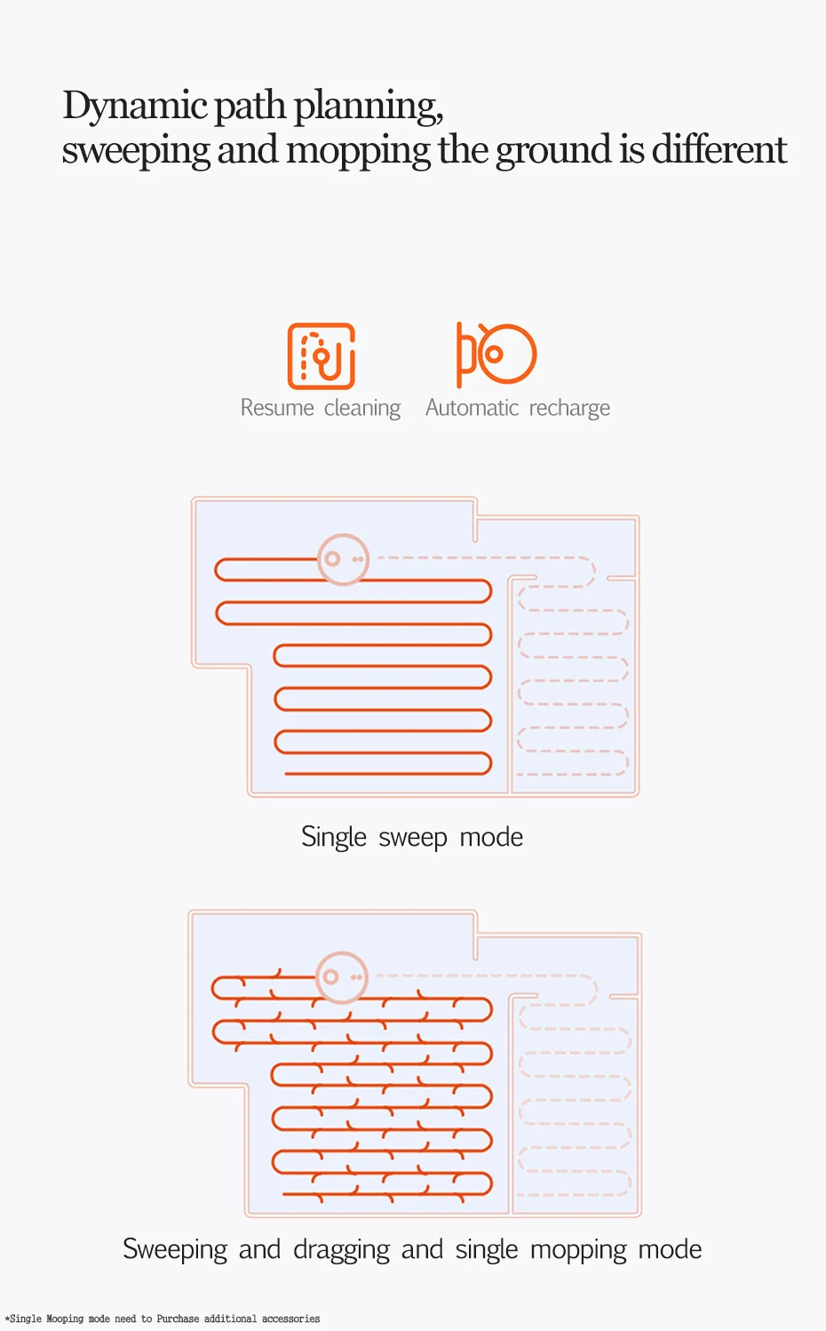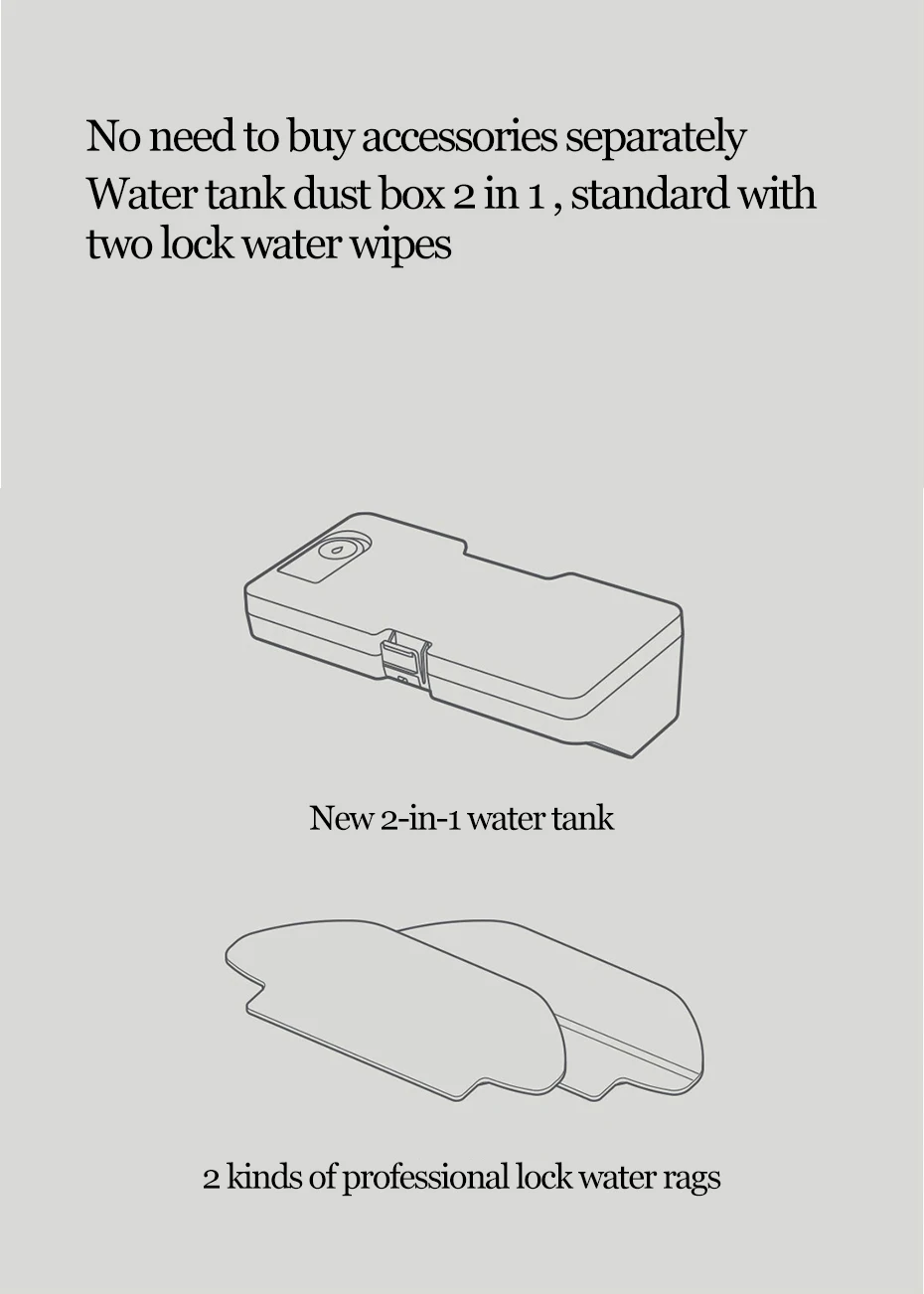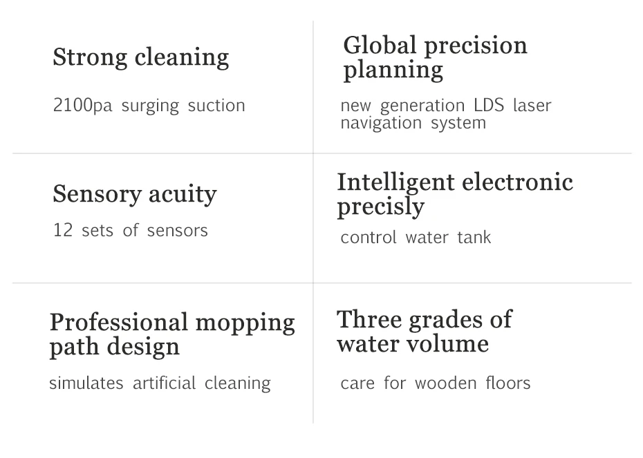 Поддержка трех режимов уборки.Имитируйте искусственную уборку, протирайте более чисто.Интеллектуальный Электрический резервуар для воды защищает деревянный пол.2100 ПА всасывания, развертки более тщательно.Улучшенная Лазерная навигация LDS всесторонне и делает карты более точными.