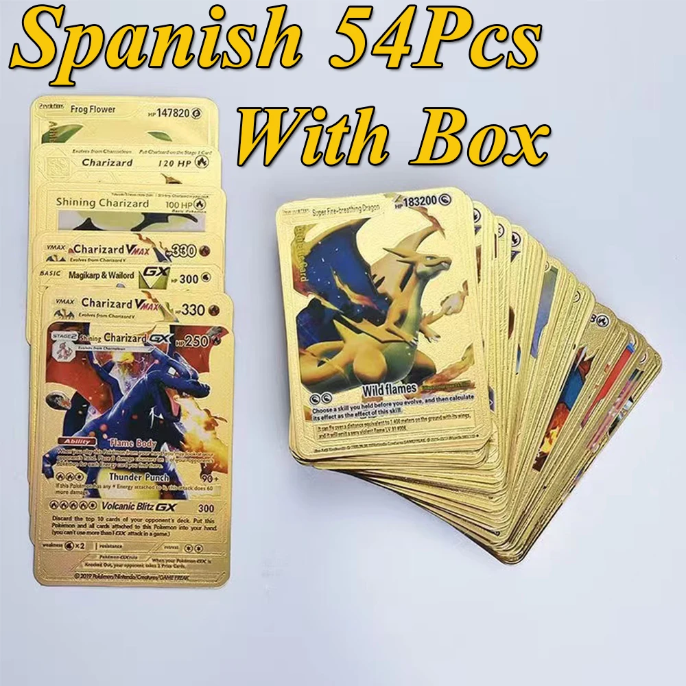 54 шт., эспанол, Покемон, металлические золотые карты, коробка, зол...