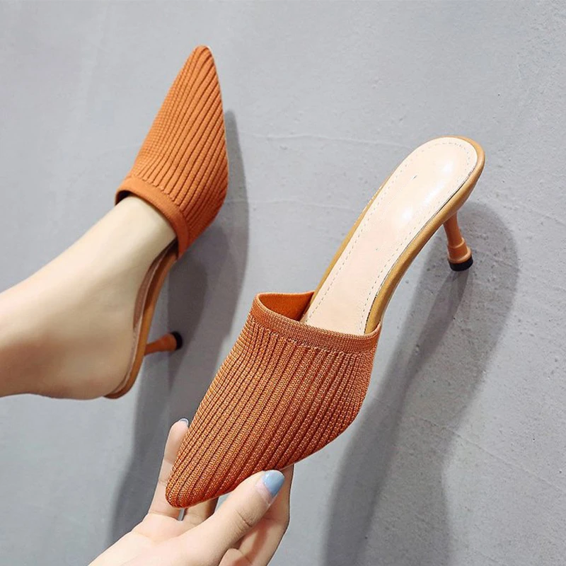 Шлепанцы женские на тонком каблуке, сланцы, вязаные элегантные сандалии, без задника, заостренный носок, Уличная обувь, весна-лето