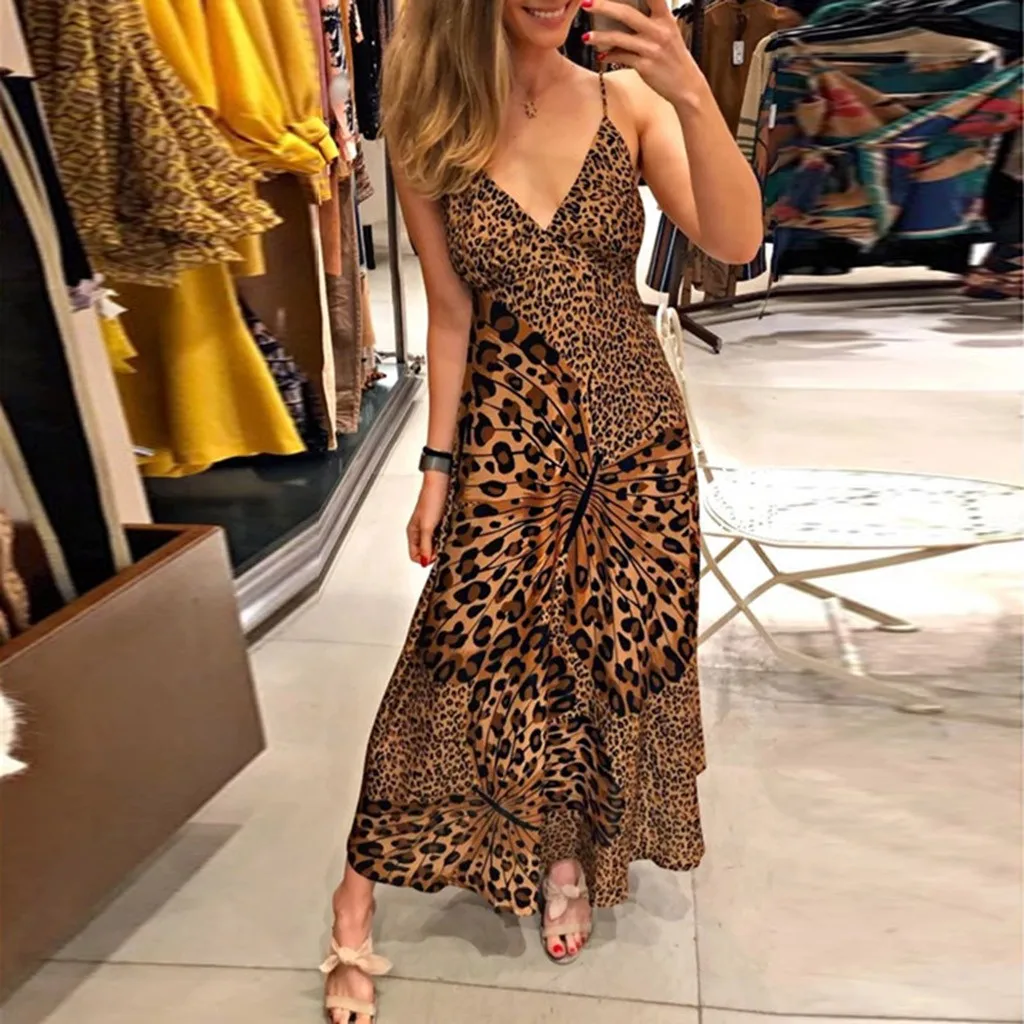 Сексуальное летнее пляжное платье для женщин с глубоким v-образным вырезом, Свободное длинное платье с леопардовым принтом, платье с открытой спиной