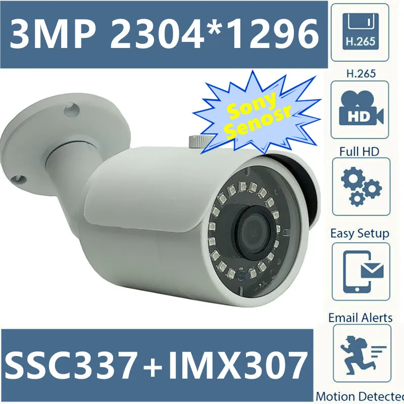 MStar SSC337 + Sony IMX307 IP внешняя фотовспышка IP66 3MP 2304*1296 25FPS H.265 Низкое освещение IR-Cut Onvif 48V PoE