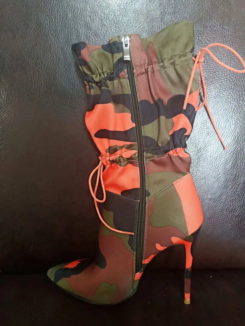 Сапоги женские, камуфляжные, на высоком каблуке, с острым носком