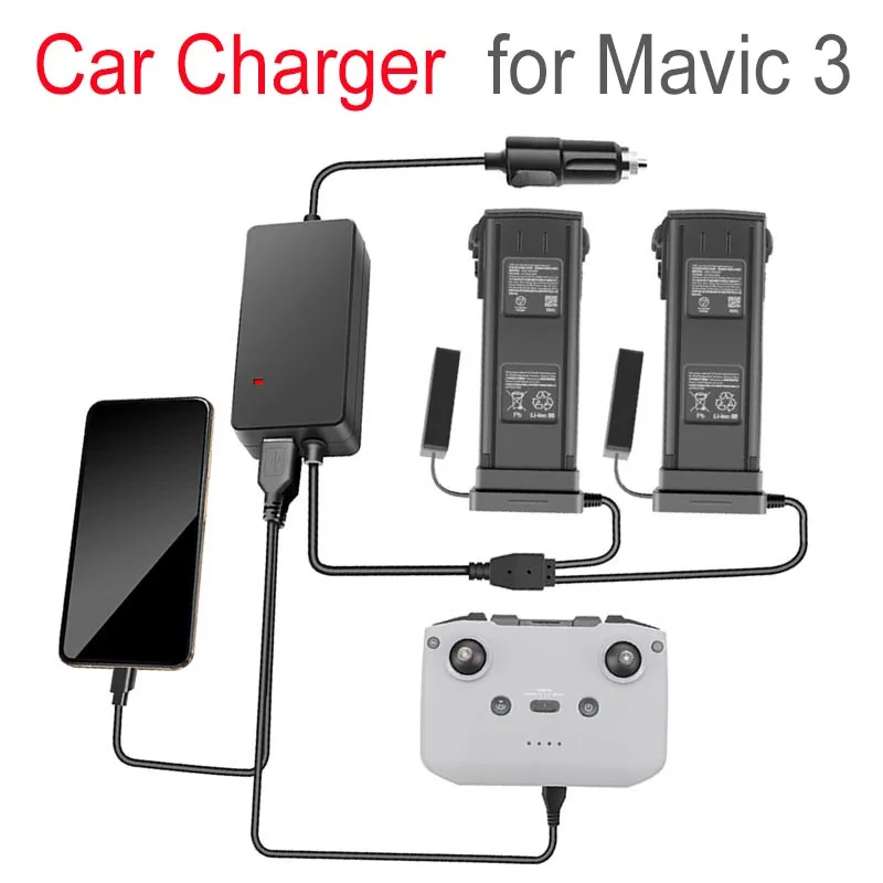 -Автомобильное зарядное устройство для DJI Mavic 3 drone дистанционное управление и зарядка аккумулятора,-Может заряжать две батареи, пульт дистанционного управления и мобильный телефон,-Для одновременной зарядки двух батарей требуется около 100 минут,-Светильник весит и очень прост в использовании, идеально подходит для вождения на открытом воздухе.