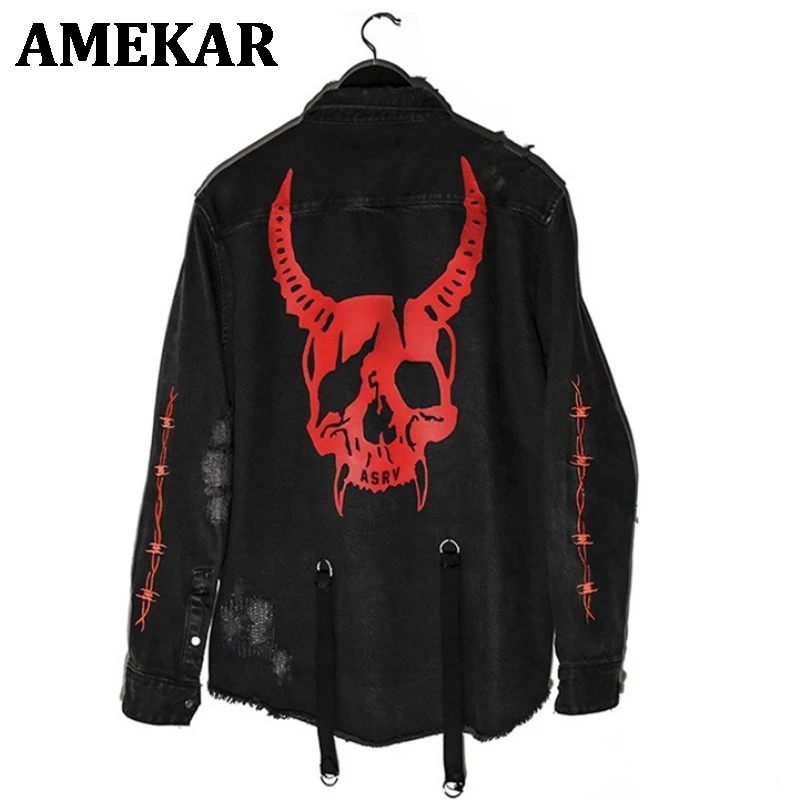 Куртка мужская джинсовая в стиле Харадзюку, готический стиль, череп...