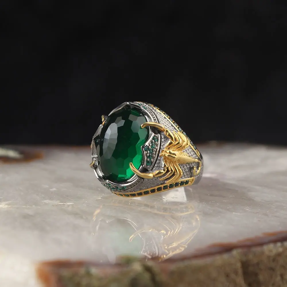 925 пробы Серебряное винтажное мужское кольцо с зеленым цирконием С...