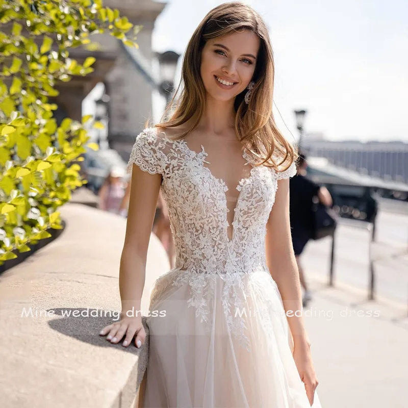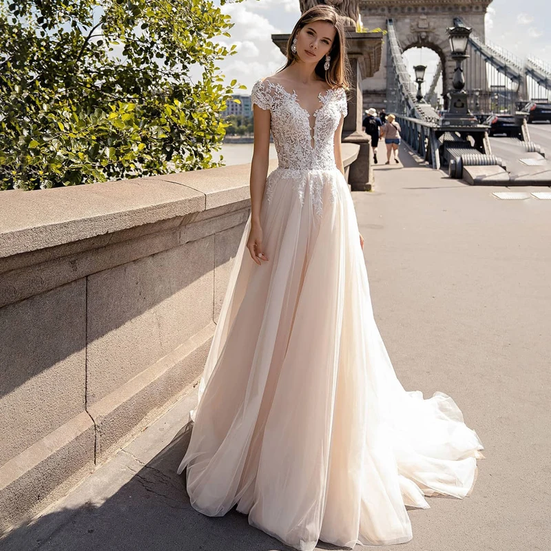 Новый дизайн, кружевное ТРАПЕЦИЕВИДНОЕ свадебное платье из тюля с круглым вырезом и аппликацией, на пуговицах, свадебные платья, 2022