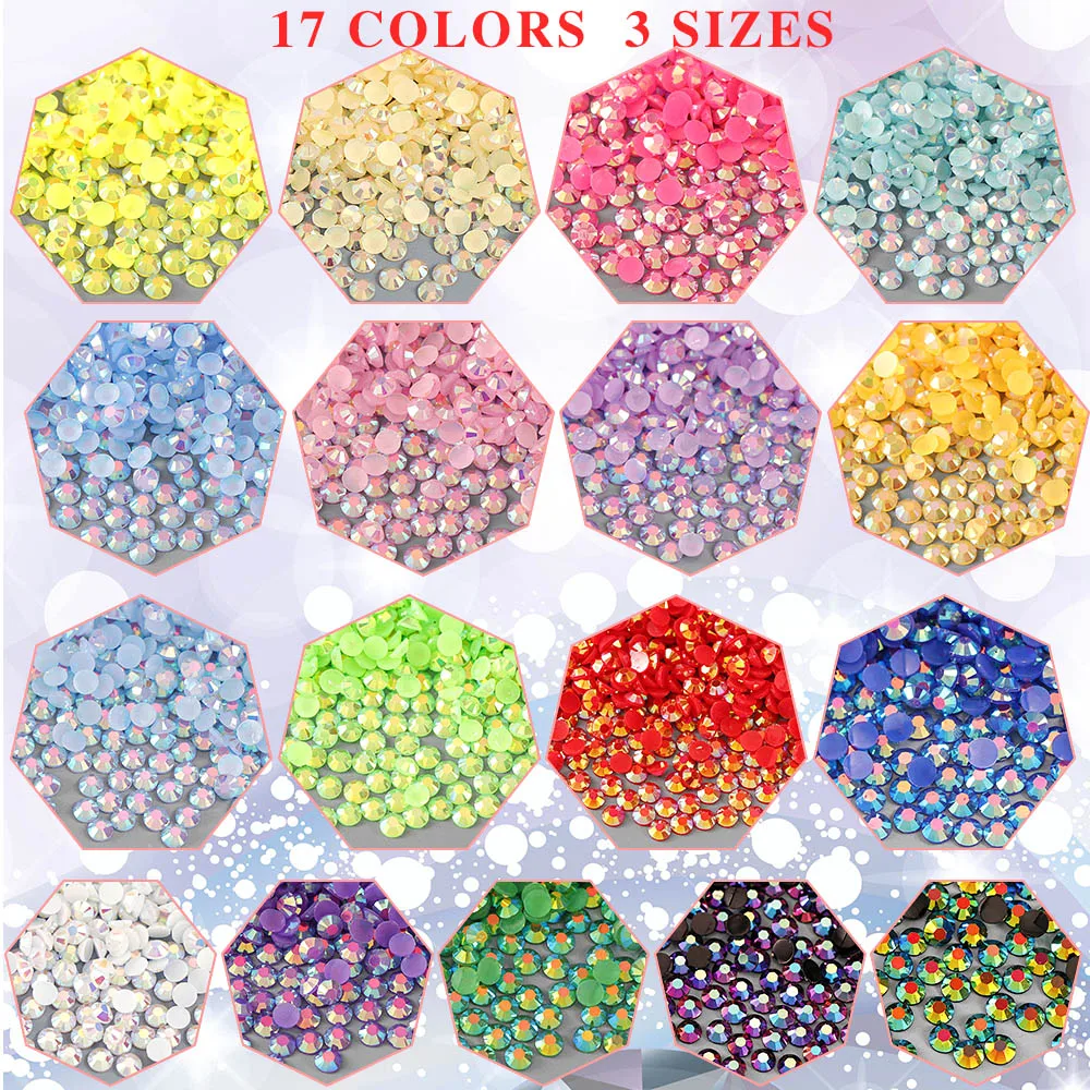 Тип Стразы: конфетный цвет AB желе стразы sМатериал: смолаРазмеры: 2/3/4 ммКоличество:2 мм -- около 1000 шт3 мм -- около 1000 шт4 мм -- около 500 штФорма: круглая плоская спинкаОсобенности: блестящийИспользуется для: DIY ручная работа, алмазная живопись, Нейл-арт, мобильный телефон/бутылка/одежда/обувь/шляпа и т. д.