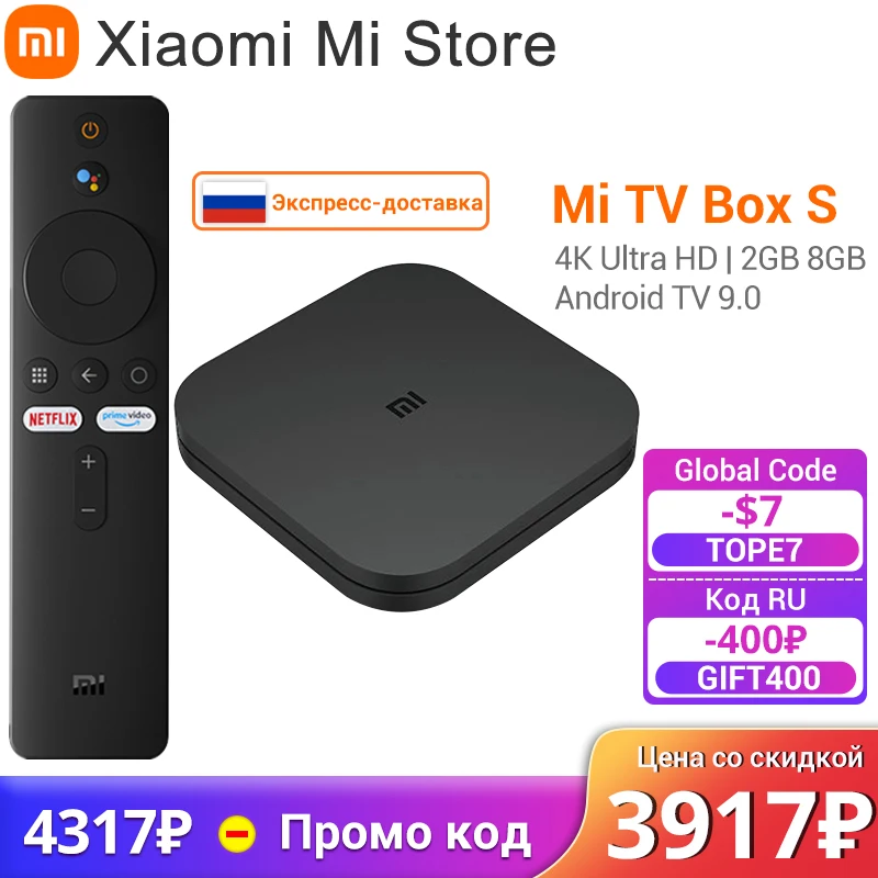 Оригинальный телефон Xiaomi Mi Box S, Android 9,0, 4K, HDR, четырехъядерный процессор Smart TV, медиаплеер, 2 ГБ, 8 ГБ, 2,4 ГГц5 ГГц, Wi-Fi, Mali-450