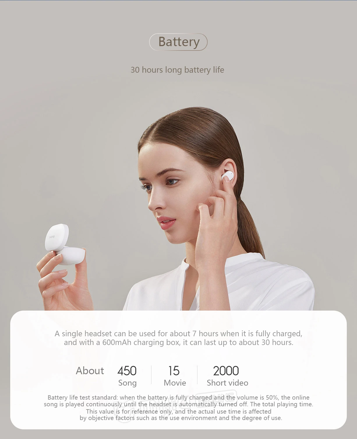 Одна гарнитура используется для полной зарядки около 7 часов, а с зарядным устройством емкостью 600 мА · ч она может работать до 30 часов. (Стандарт проверки срока службы батареи: когда аккумулятор полностью заряжен и объем составляет 50%, онлайн-песня воспроизводится непрерывно до тех пор, пока гарнитура не выключится автоматически. Общее время игры.) Это значение только для справки, и фактическое время использования зависит от объективных факторов, таких как среда использования и степень использования.