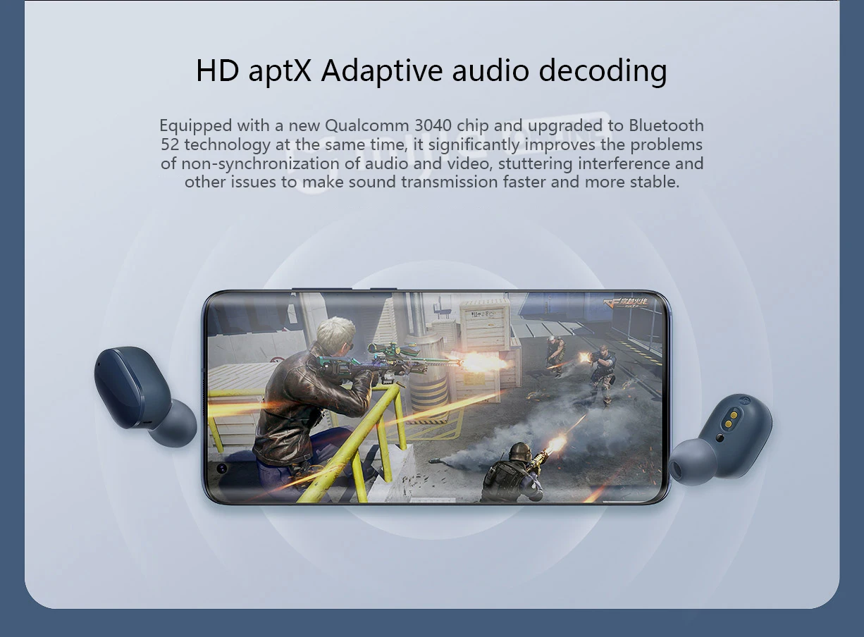 Совершенно новый чип Qualcomm 3040 одновременно обновлен до технологии Bluetooth 52, что может значительно улучшить такие проблемы, как асинхронный звук и изображение, помех и т. д. Чтобы сделать передачу звука более быстрой и стабильной. Поддержка адаптивного декодирования аудио aptx, установка высокого качества звука и низкая задержка в одном