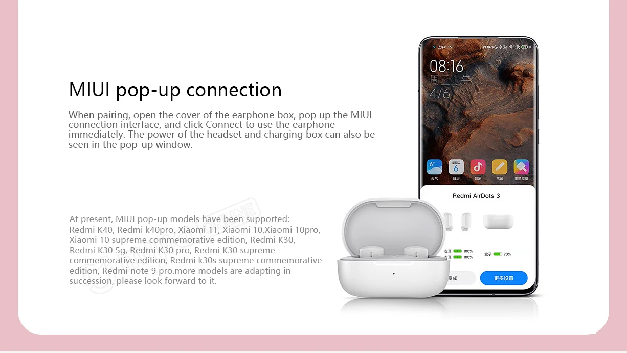 При сопряжении Откройте крышку коробки для наушников, откройте интерфейс подключения MIUI и нажмите «подключить», чтобы немедленно использовать наушники. Питание гарнитуры и зарядного устройства также можно увидеть во всплывающем окне. (Всплывающее окно адаптер может отличаться из-за индивидуальных различий продукта, версий программного обеспечения, особенностей продукта, условий эксплуатации и экологических факторов. Пожалуйста, ознакомьтесь с реальной ситуацией. Если некоторые функции не работают должным образом, рекомендуется обновить Мобильный телефон Xiaomi до последней версии MIUI и повторите попытку. В настоящее время поддерживаются всплывающие модели MIUI: Redmi K40, Redmi k40pro, Xiaomi 11, Xiaomi 10, Xiaomi 10pro, Xiaomi 10 supreme Memory edition, Redmi K30, Redmi K30 5g, redmi K30 pro, Redmi K30 supreme Memorial edition, Redmi k30s supreme Memorial edition, Redmi note 9 pro, И т. Д. Больше моделей адаптируются друг к другу, пожалуйста, с нетерпением ждем его.)