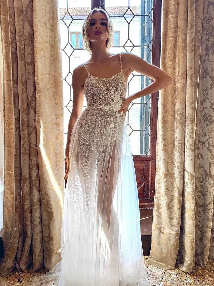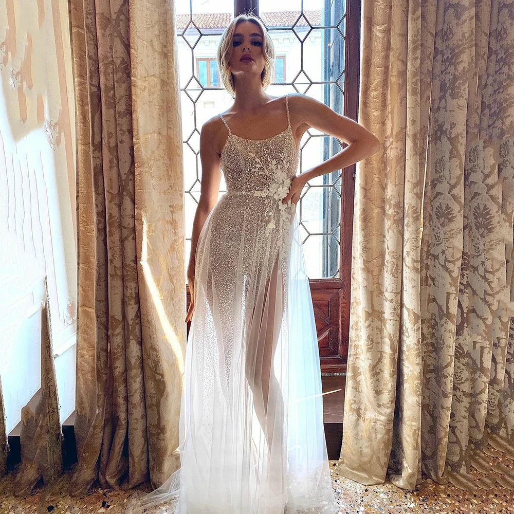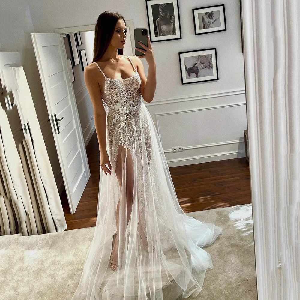UZN сексуальные блестящие тюлевые Прозрачные Свадебные платья с аппликацией цветы Свадебные платья на тонких бретельках платье для невесты