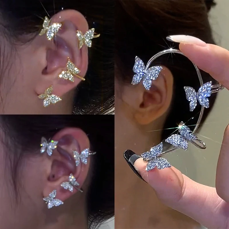 Корейские Позолоченные и серебряные Клипсы-бабочки для ушей, имитация пирсинга для женщин, сверкающие циркониевые клипсы для ушей, серьги-клипсы, аксессуары