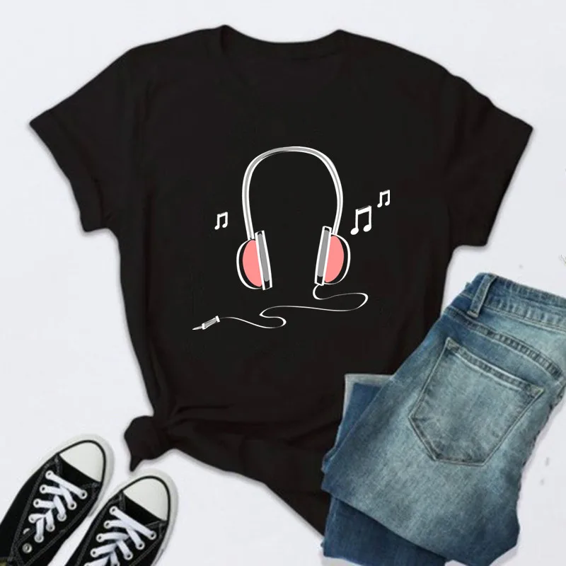 Женская одежда 2022, черные топы с принтом музыкальных нот, женская летняя футболка с коротким рукавом и круглым вырезом, топы, одежда для женщин