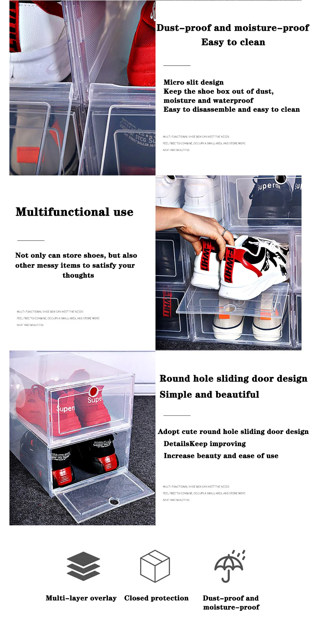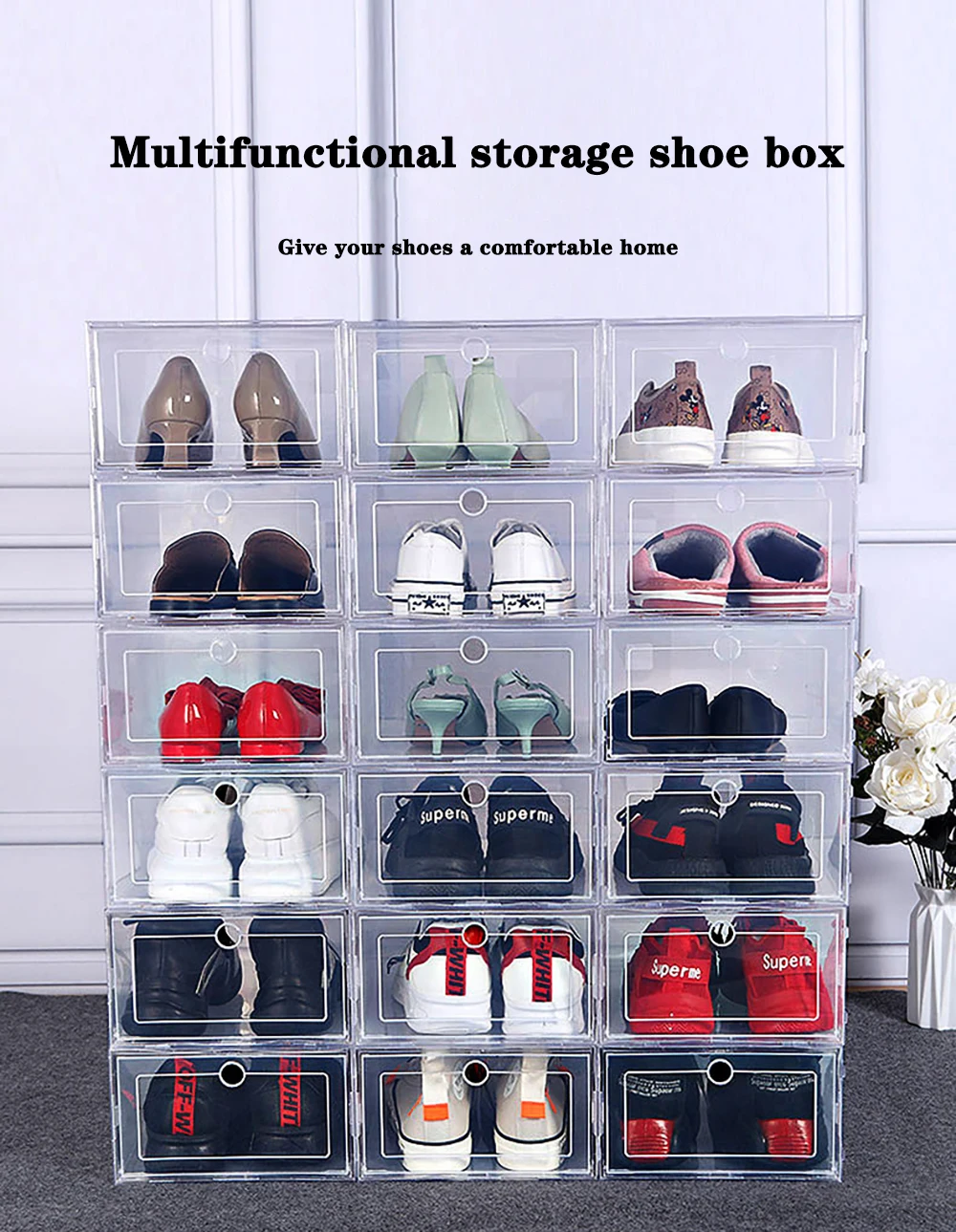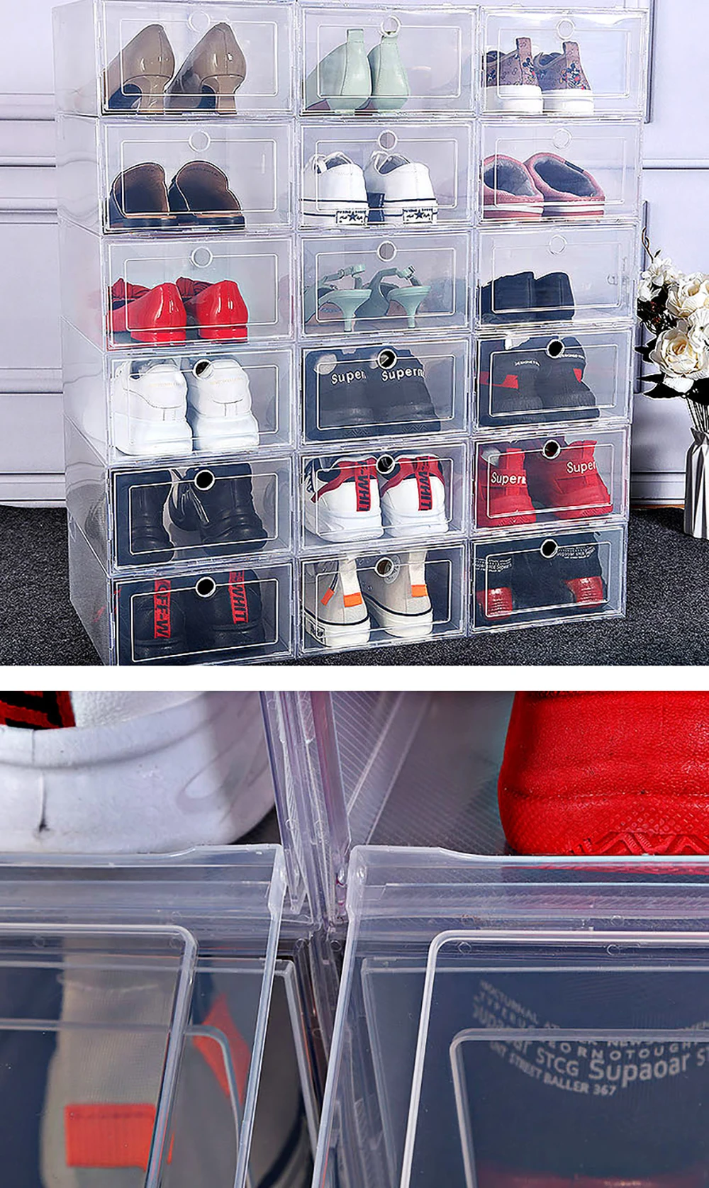 Функція продукту: прозора коробка для взуття. Матеріал зовнішнього вигляду: чистий, прозорий, дуже простий в установці. Якість продукту: товстий матеріал, який може вмістити більше однієї пари взуття, кімната охайна в найкоротші терміни. Мені це дуже подо