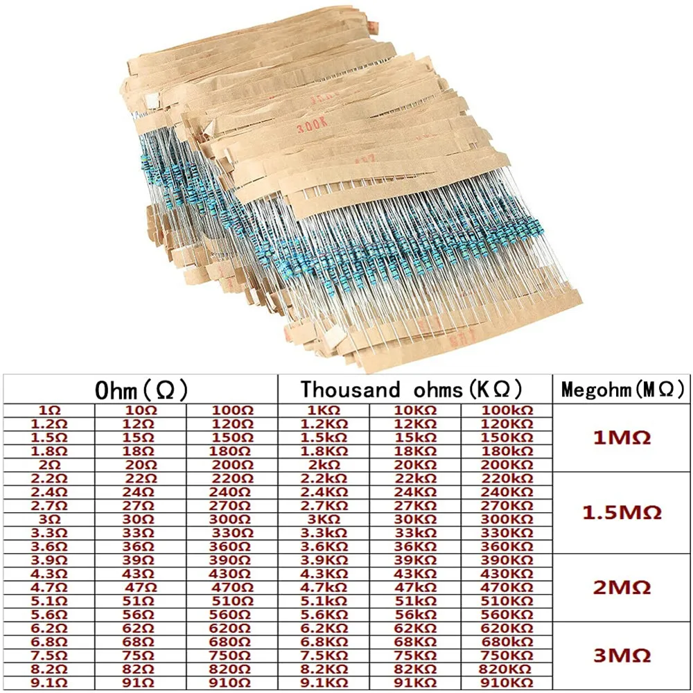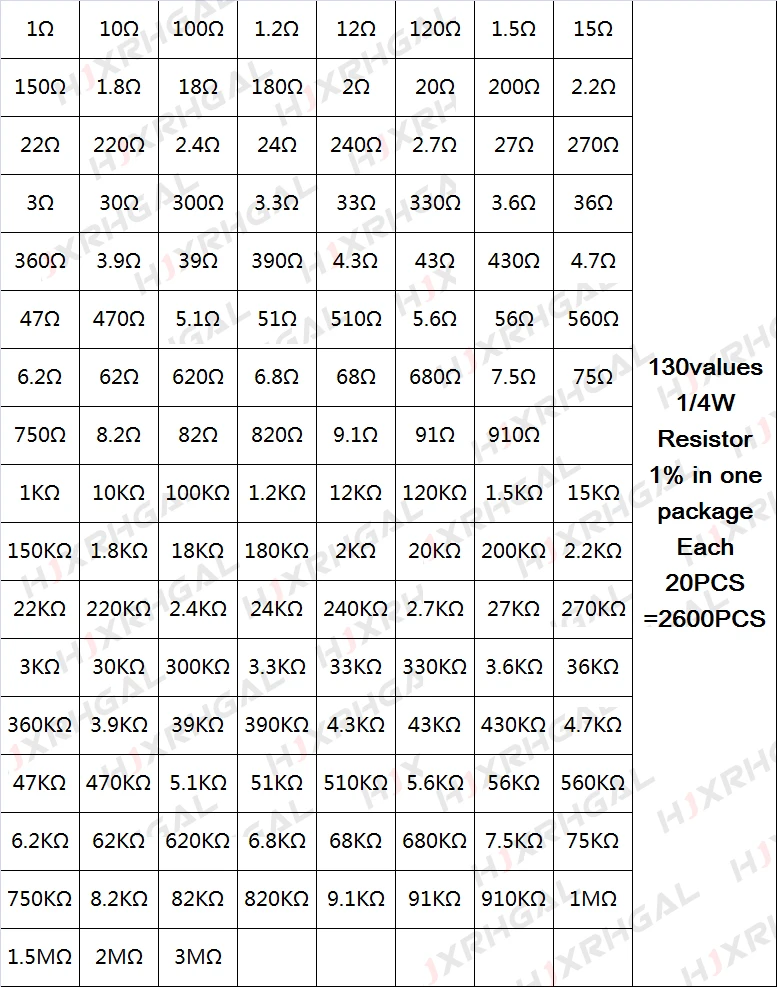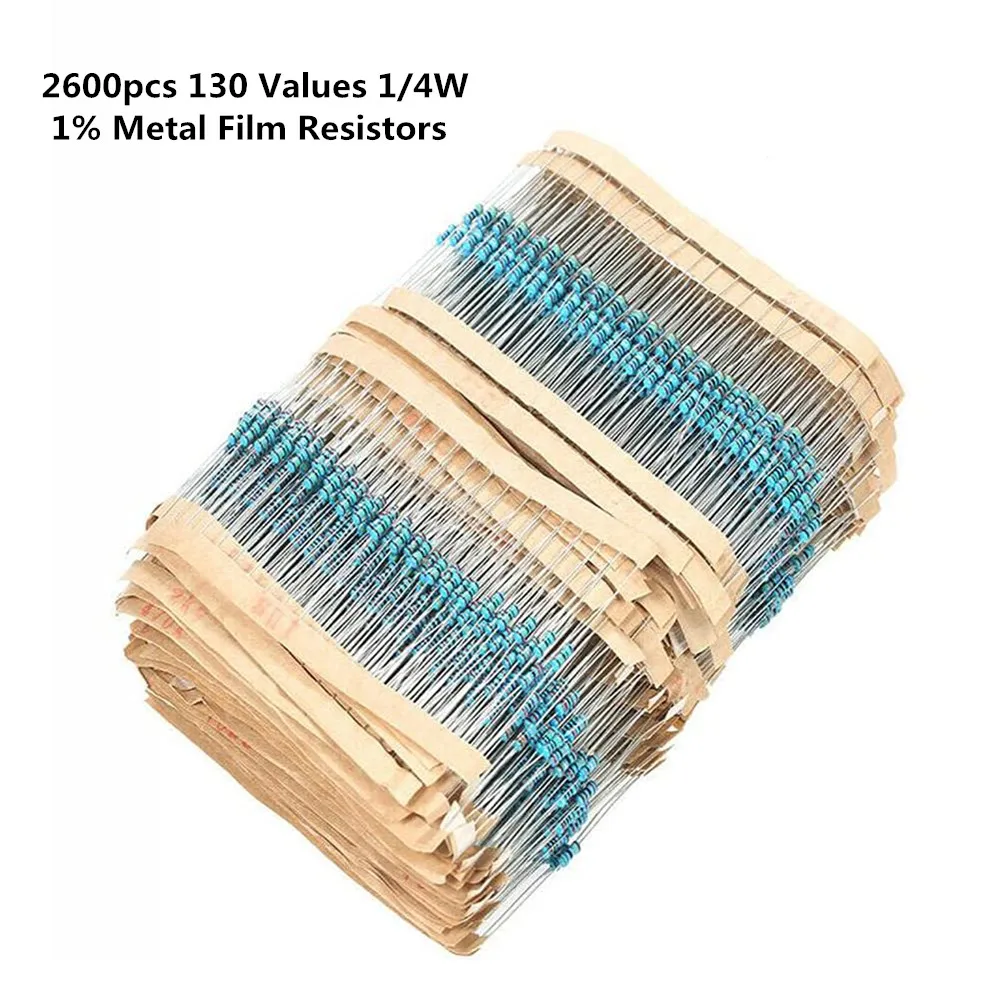 2600 шт.лот 130 значения 14 Вт 0,25 Вт 1% Металлические пленочные резисторы, набор в ассортименте, набор резисторов, ассортимент, комплекты фиксированных резисторов