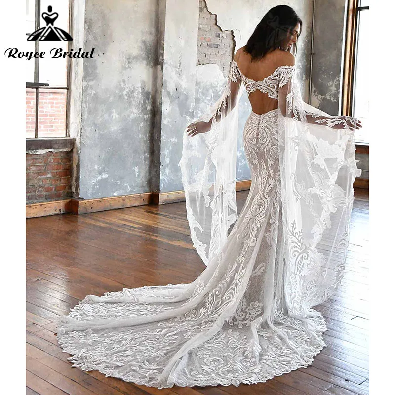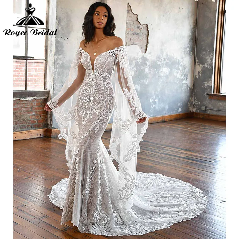 Винтажное свадебное платье-русалка в стиле бохо, с глубоким V-образным вырезом и кружевной аппликацией, с длинным расширяющимся книзу рукавом, 2022 Robe Mariage Roycebridal