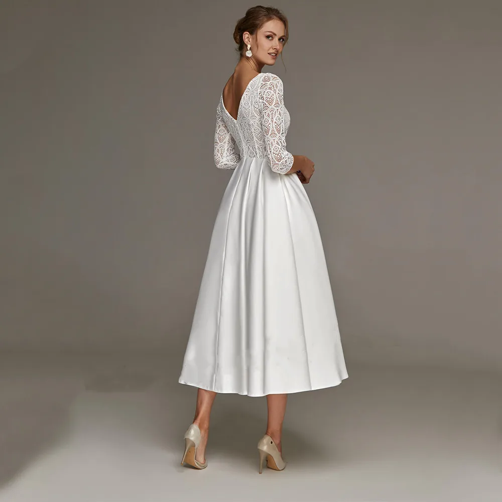 Женское свадебное платье до середины икры, элегантное белое платье невесты в стиле гражданской, а-силуэт с рукавами и V-образным вырезом