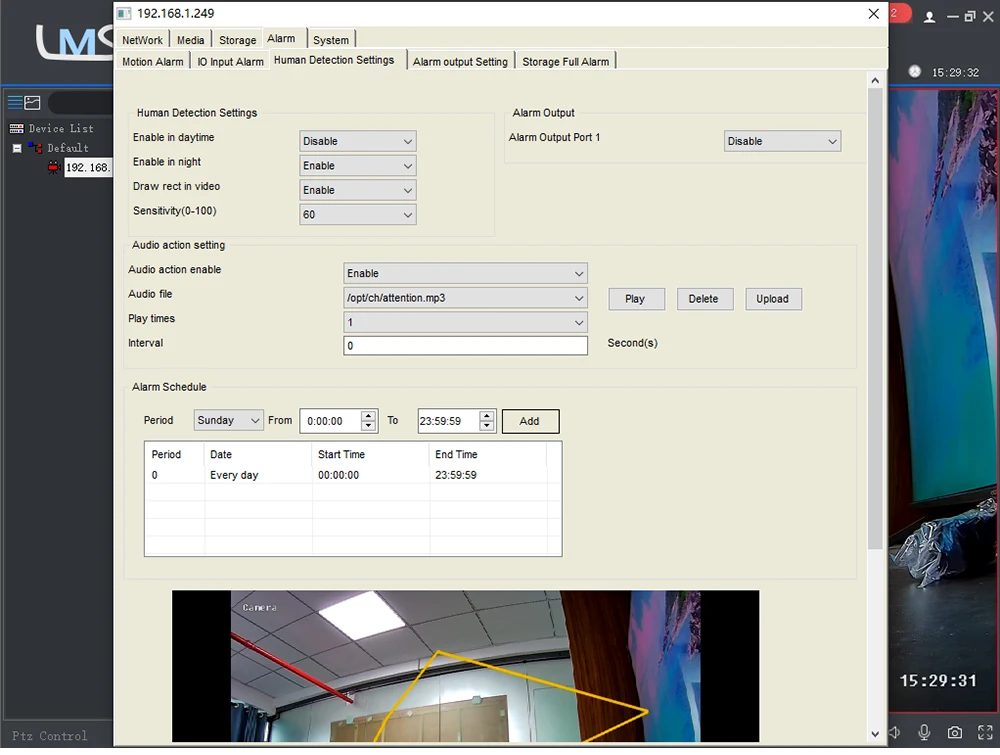 Вы можете создавать настройки обнаружения движения для камеры, включая обнаружение человеческого тела, обнаружение пересекающихся линий, обнаружение вторжений и определение конкретных регионов.(Этот человек должен работать на Danale NVR, тогда будет иметь человеческую линию)