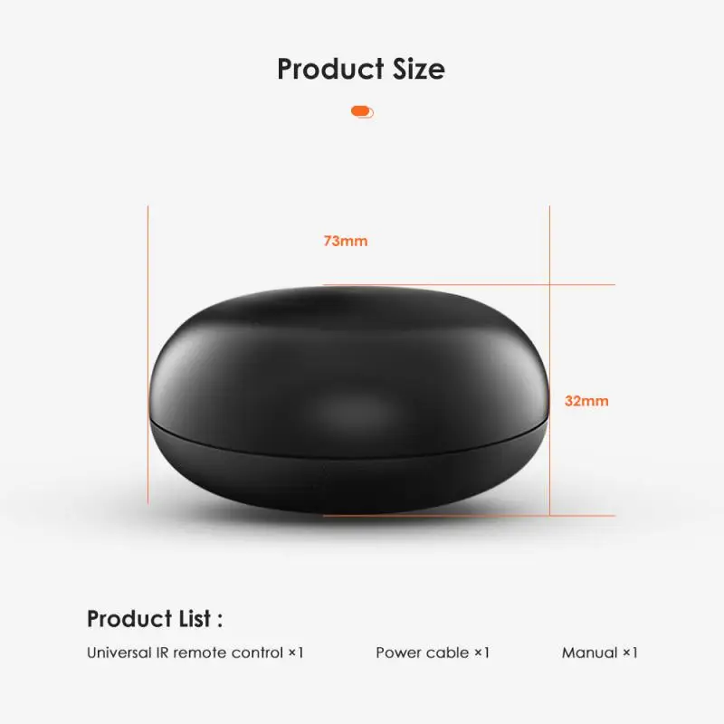 Основные функции: дистанционное управление через мобильный телефон App, голосовое управление через Alexa и Google Home, поддержка всех бытовых приборов, которые используют инфракрасный сигнал