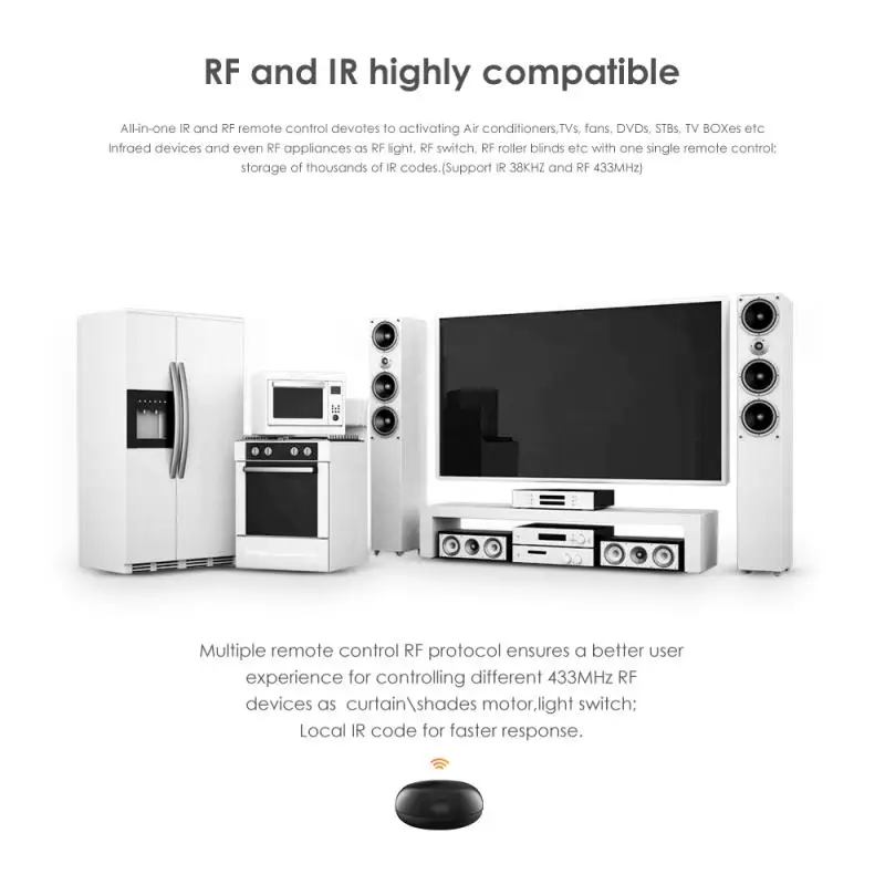 2. Радиочастотный протокол с несколькими пультами дистанционного управления обеспечивает лучший пользовательский опыт для управления различными радиочастотными устройствами 433 МГц в качестве мотора занавесок, переключателя на светильник; Локальный ИК-код для более быстрого ответа.
