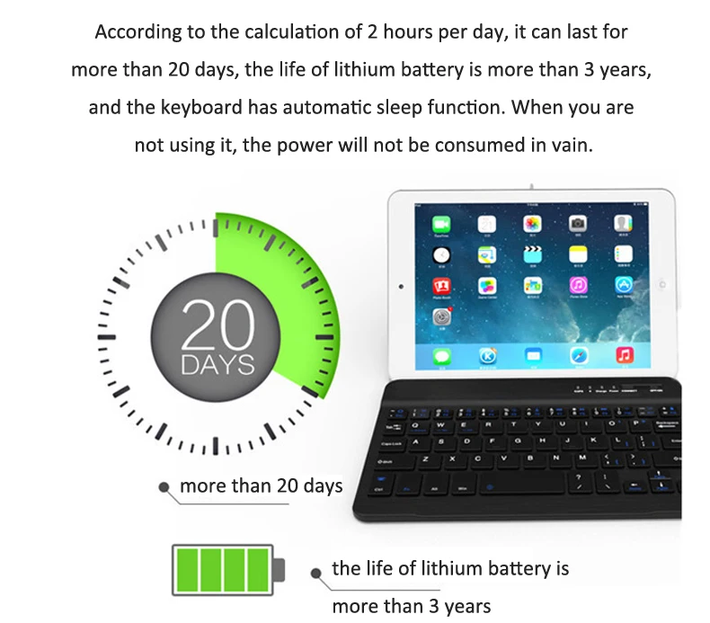 ОсобенностиВысокое качество 100% новый бренд1. Идеальный, высококачественный чехол для планшета2. Изготовлен из высококачественного материала.3. Модный дизайн, легко надевается и легко снимается.4. Идеально подходит к форме.5. Прочный и моющийся.6. Защитите ваше оборудованиеОт пыли, царапин и ударов.7. Защитите ваши ценные инвестиции от царапин и повреждений.Метод использования:【 1 】; Откройте bluetooth-клавиатуру [OFF/ON], откройте для включения, включите питание【 2 】; В то же время нажмите кнопку клавиатуры [Fn + C], заглушки мерцают【 3 】; Откройте устройство (планшет), чтобы открыть функцию поиска Bluetooth, найдите [Bluetooth 3 Клавиатура], нажмите на соединение【 4 】; Введите код проверки [четыре цифры], нажмите [ввод] для успешного подключения, хорошоКлавиатура быстрого доступа:Fn + space = метод ввода переключателяFn + Ctrl = кнопка возврата главной страницыFn + Win: close touchFn + F11: Увеличение громкости