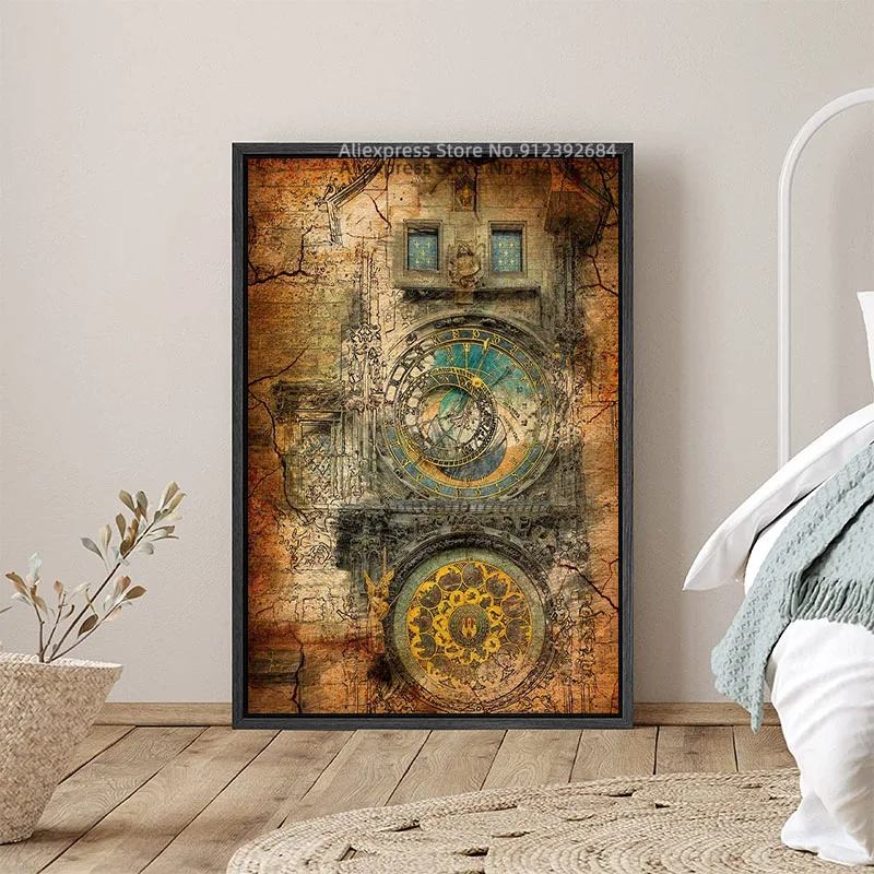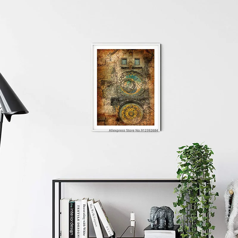 Старые корабли, винтажные городские часы, орлой, Прага, плакат, абстрактная картина, настенное искусство, холст, принты, картины, украшения, живопись для дома