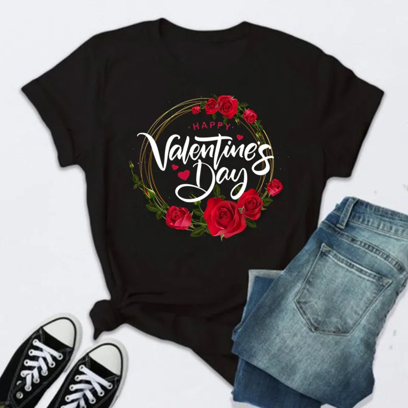 Новинка 2022, модная женская одежда, дизайнерская футболка с красной розой на День святого Валентина, повседневная черная футболка, женский топ с коротким рукавом, рубашка