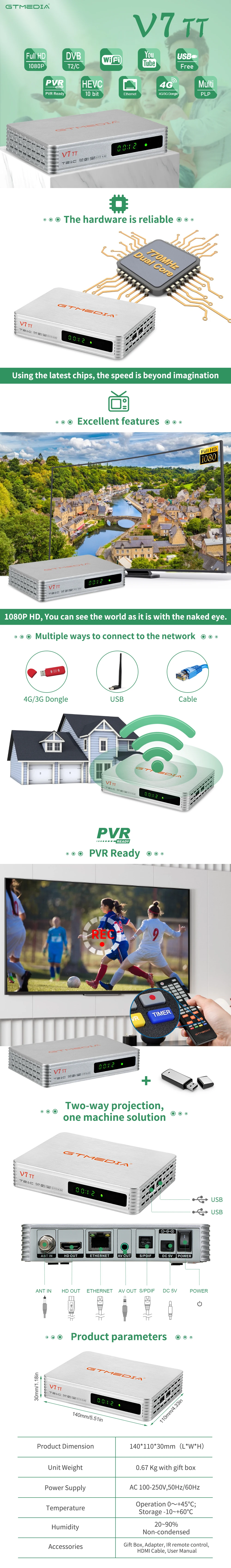 GTMEDIA V7 TT 1080P Full HD DVB-T/T2/DVB-C/J.83B, поддержка H.265 HEVC 10-битный наземный приемник HD цифровой ТВ-тюнер Поддержка декодера YouTub CCam телеприставка