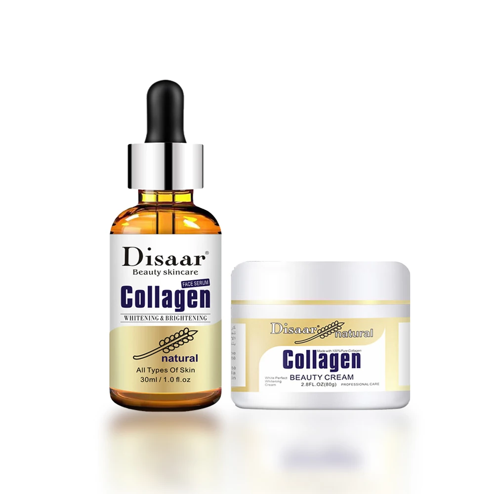 【Коллагеновый крем для лица 80 г 】улучшает сухость и обезвоживание кожи, делает кожу мягкой и гладкой уменьшает старение кожи, разглаживает морщины, оставляя кожу нежной, лучистая эффективная активация старения кожи и восстанавливает напряжение кожи быстро способствует синтезу и росту коллагена.【Коллагеновая Сыворотка для лица 30 мл этот продукт обогащен отбеливающими и увлажняющими ингредиентами, такими как арбутин, эффективно выцветает меланин и глубоко увлажняет кожу, делая ее блестящей.