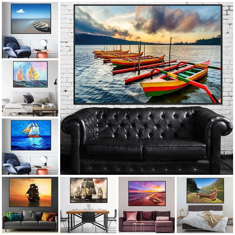 Печатная картина в скандинавском стиле, красочная парусная лодка, закат, морской пейзаж, модульная холщовая картина без рамки, плакат, украшение для стены, домашнее искусство