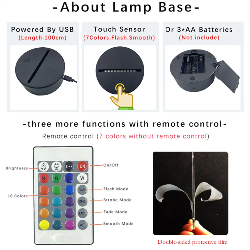 Характеристика:• 7 цветов: красный, зеленый, синий, желтый, голубой, розовый, белый• Сенсорная кнопка: Нажмите один раз, один цветной светильник вверх, нажмите его снова, он выключается. Нажмите на него в-третьих, другой цветной светильник.• Автоматический режим изменения цвета. Нажмите сенсорную кнопку, чтобы сохранить цвет, затем нажмите его снова, режим автоматического изменения цвета работает.• Поставляется с адаптером питания USB, вы можете подключить его к домашней розетке или usb-порту компьютера.• Экономия энергии. Потребляемая мощность: 0012 кВт. Ч/24 часа; Светодиодный срок службы: 10000 часов• Его можно поместить в спальню, детскую комнату, гостиную, бар, магазин, кафе, ресторан и т. д. как декоративный светильник.Спецификация:Материал: акрил и АБС-пластикПитание: USB кабель (посылка входит в комплект), или 3 батареи xAAA (не входят в комплект)Посылка:1 x 3D иллюзионный светильник1 х USB кабель