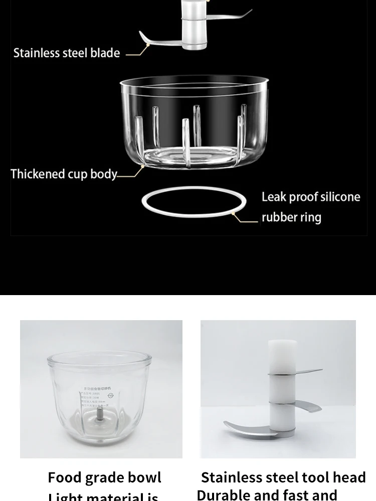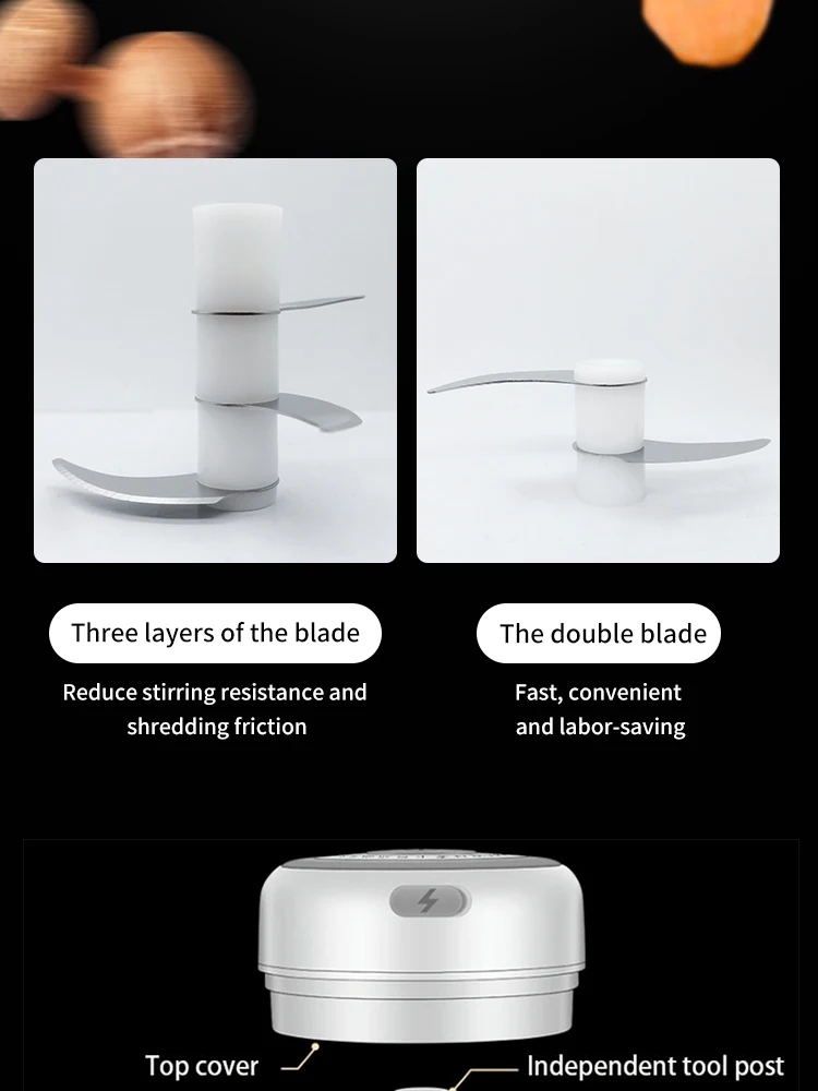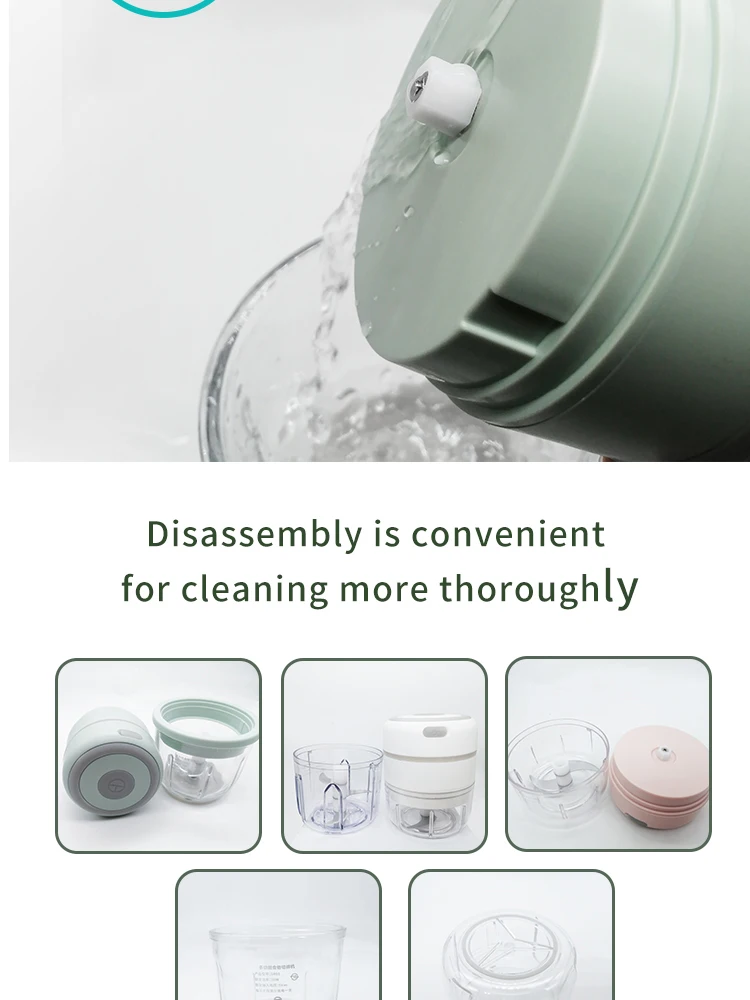 Емкость 1,250 мл отвечает потребностям чеснока, Чили лапши, взбитых яиц и домашних тортов2. Мы также разработали мощную многофункциональную давилка чеснока. Этот продукт может не только разомнить чеснок, но и изменить головку давилка для яиц, а мощная и мощная давилка чеснока использует тот же двигатель.3. Usb-зарядка может не только решить проблему безопасности использования электроэнергии, но и предоставить Вам возможность использования в случае отключения электроэнергии.4. Функция анти-случайного касания, для того, чтобы дети не были случайно ранены, когда наш продукт включен, он должен дважды нажать переключатель, чтобы начать нормально.5. Трехскоростная регулировка, подходит для измельчения различных пищевых продуктов.