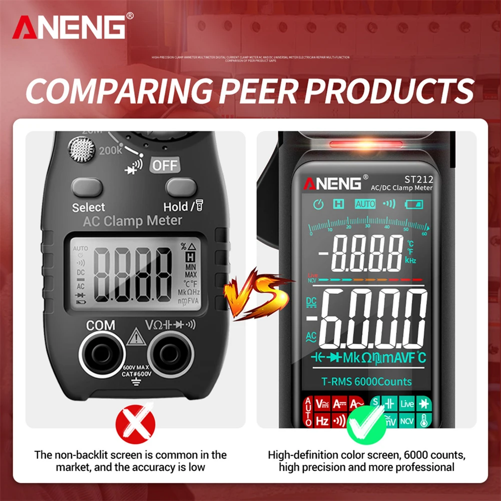 Цифровой мультиметр-зажим ANENG ST212, 6000 отсчетов, Постоянныйпеременный ток, тестер сопротивления, частоты, емкости, Бесконтактный индикатор напряжения
