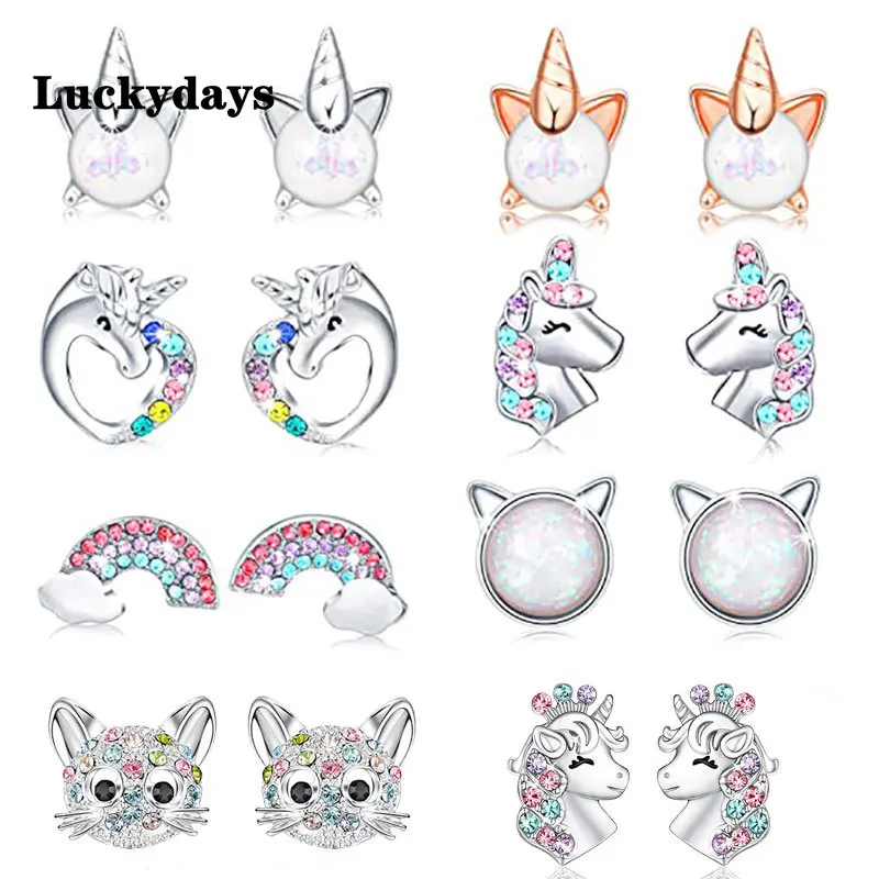 Серьги-гвоздики в виде единорога для маленьких девочек, хрустальные украшения для детей, кошек, бабочек, радуги, сердца, звезд, рождественский подарок, бижутерия