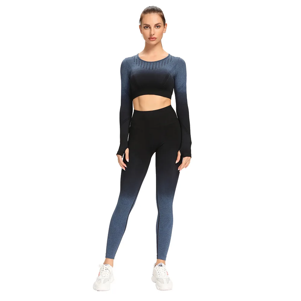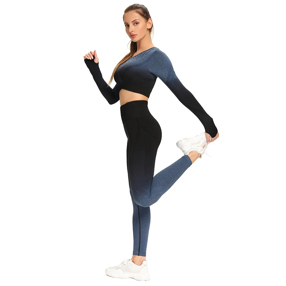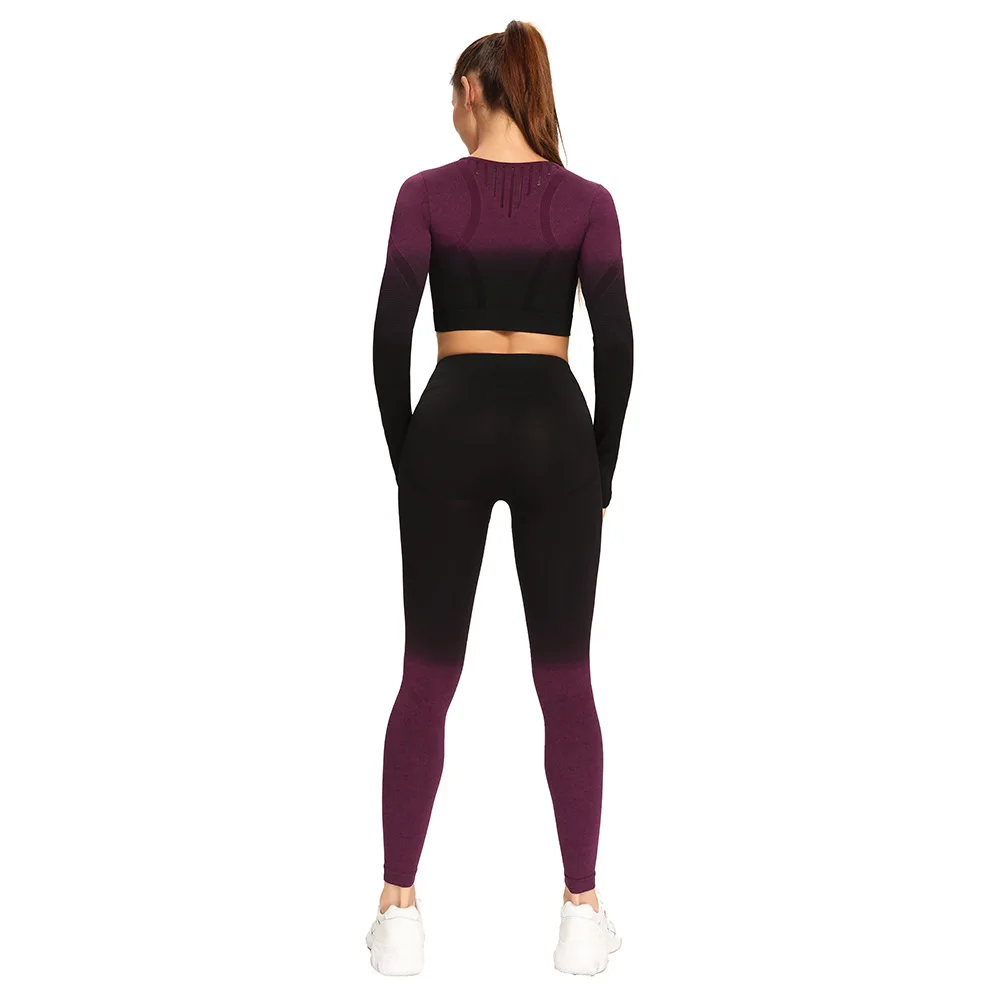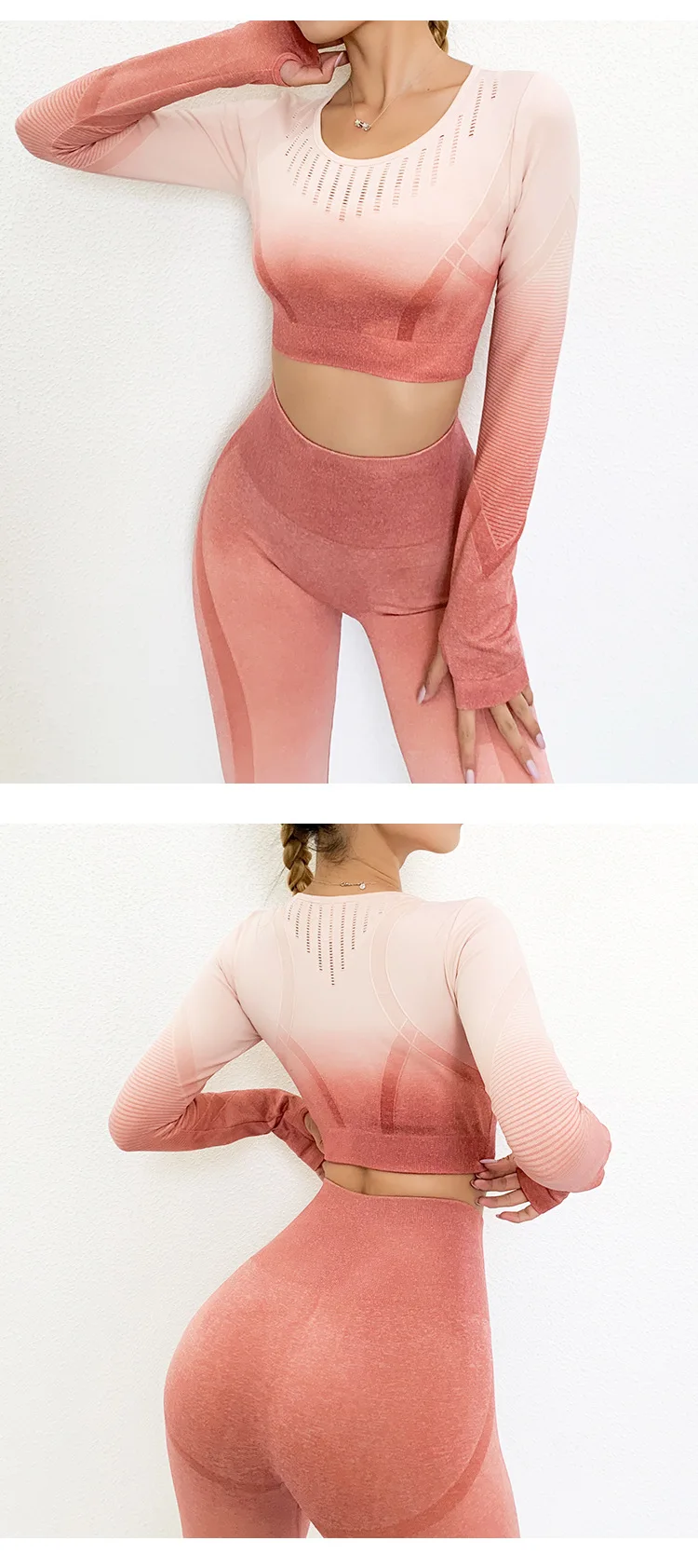 Костюм для йоги женские спортивные Леггинсы с высокой талией Топ с длинным рукавом спортивный бюстгальтер Омбре одежда для бега и фитнеса бесшовный тренировочный костюм