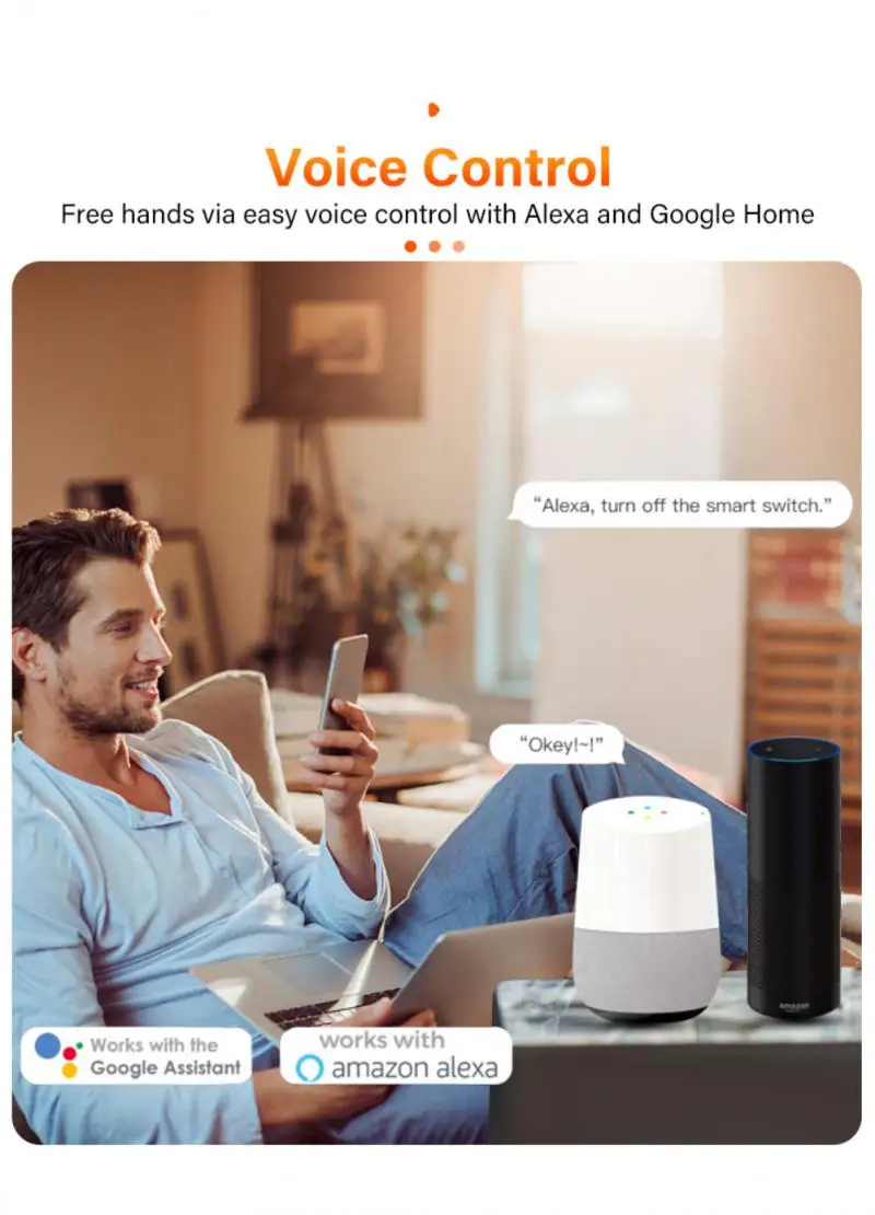 Поддержка голосовых помощников, таких как Tmall Genie, Alexa, GoolHome, и реализации функций, таких как переключатели; «Alexa, включите Кухонные светильники». Вы можете включить свет в одном предложении и наслаждаться удобной умной жизнью.