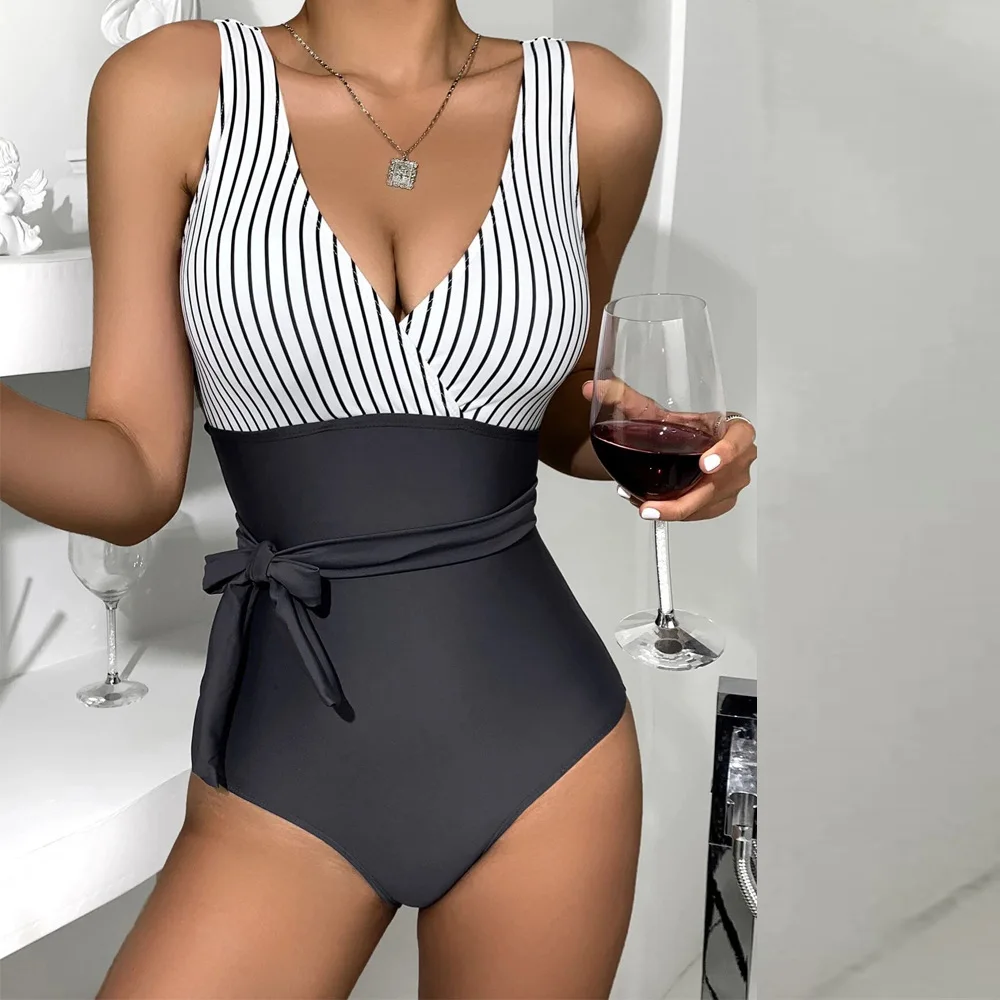 Полосатый купальник, женский слитный купальник 2022, женский купальник, бикини, Монокини пуш-ап, сексуальный слитный купальник с V-образным вырезом