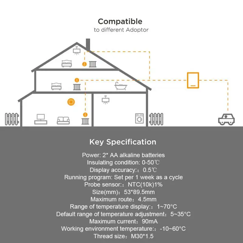 Он подходит для жилых, торговых, гостиничных отопления и центрального контроля температуры кондиционирования воздуха. Он оснащен совместимыми разъемами. Это умный помощник по контролю температуры. Он имеет режим отпуска и отдыха. Ежедневную температуру можно установить индивидуально; Время работы устройства можно установить в приложении smart life, с мини-дизайном, простой работой, удобным дисплеем и экономией пространства; еженедельные настройки программирования могут быть установлены в течение 5, 2, 6, 1, 7 дней и шести периодов.