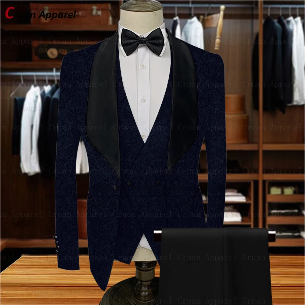 Роскошные жаккардовые черные мужские костюмы, облегающий свадебный смокинг для жениха и шали, под заказ, с отворотом, королевский синий пиджак, жилет, брюки, 3 шт.
