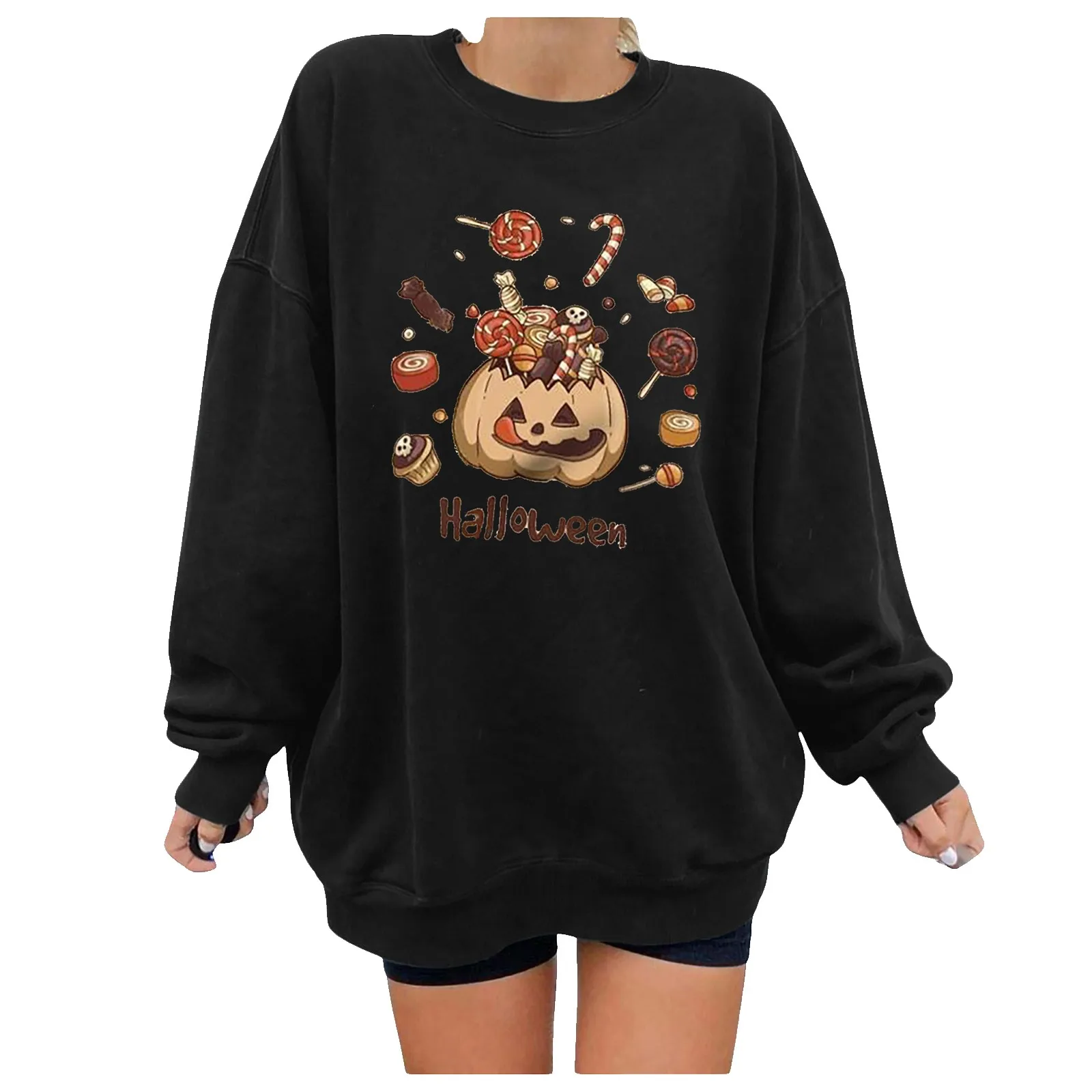 Толстовка женская с капюшоном, Свитшот оверсайз с милым принтом на Хэллоуин, повседневный пуловер с круглым вырезом, уличная одежда