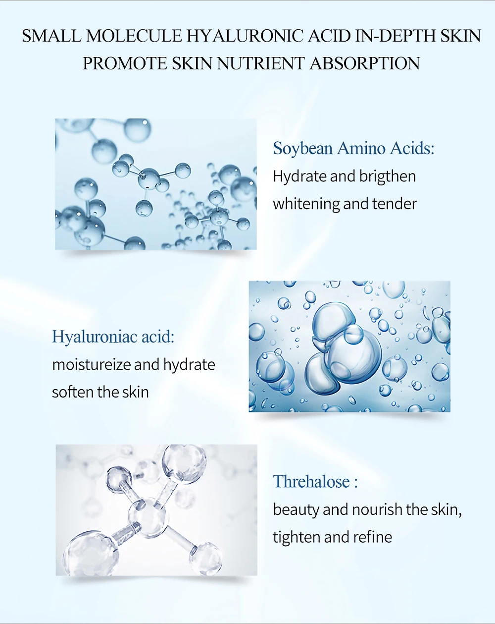 Добавьте эссенцию гиалуроновой кислоты, увлажните и увлажните хрупкую кожу. Дайте коже пить много воды; Помогите основной коже впитать, улучшить сухую кожу, нехватку воды, глубокое увлажнение, отнастоящее время нет жажды «коже», прикосновение воды нежное!
