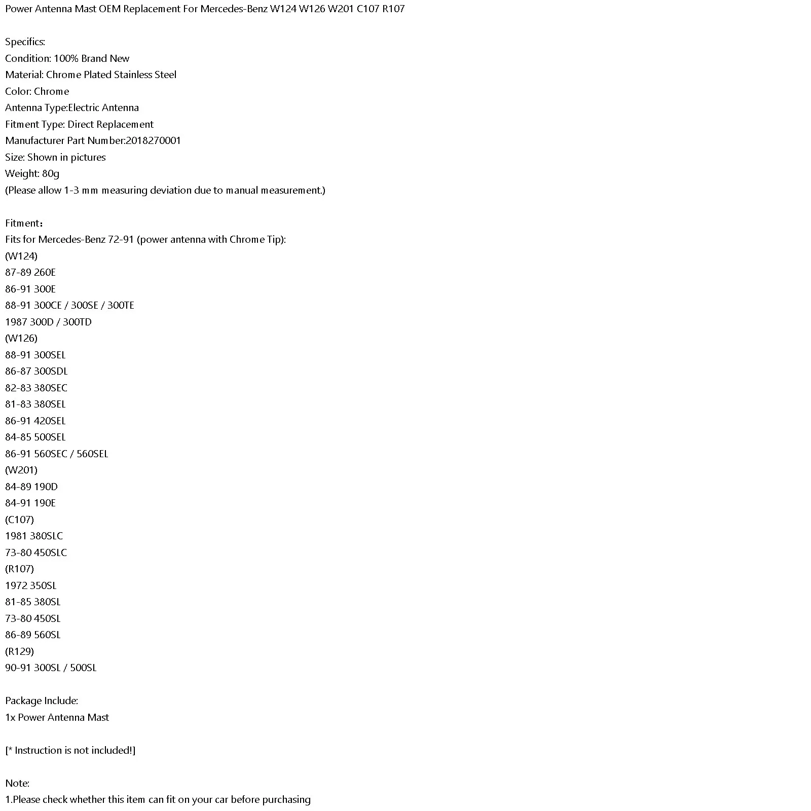 Усилитель антенны мачты OEM Замена для Mercedes-Benz W124 W126 W201 C107 R107Характеристика:1: согласно оригинальным заводским спецификациям, идеально подходит для оригинального автомобиля.2: собственные различные испытательные машины для разработки точного параметра для наших продуктов. Все переключатели были протестированы на производительность.3: Изготовлен из высококачественного материала, легкий, антикоррозийный, цветной и прочный.4: послепродажный продукт высокого качества.5: стабильная производительность, высокая надежность, подходит для замены сломанного.Особенности:Состояние на 100% абсолютно новыйМатериал: хромированная нержавеющая стальЦвет: хромТип антенны: электрическая антеннаТип установки: прямая заменаНомер детали производителя: 2018270001Размер: показан на фотографииВес: 80 г(Возможны отклонения в 1-3 мм вследствие измерений вручную.)Приспособление:Подходит для Mercedes-Benz 72-91 (антенна питания с хромированным наконечником):(W124)87-89 260E86-91 300E88-91 300CE / 300SE / 300TE1987 300D / 300TD(W126)88-91 300SEL86-87 300SDL82-83 380 сек81-83 380SEL86-91 420SEL84-85 500SEL86-91 560SEC / 560SEL(W201)84-89 190D84-91 190E(C107)1981 380SLC73-80 450SLC(R107)1972 350SL81-85 380SL73-80 450SL86-89 560SL(R129)90-91 300SL / 500SLПосылка включает:1 мачта антенны питания[* Инструкция не включена!]Примечание:1. Пожалуйста, проверьте, может ли этот товар поместиться на вашем автомобиле перед покупкой