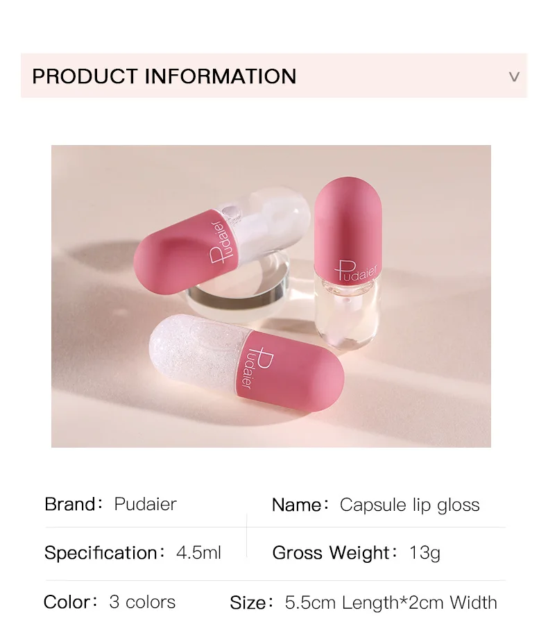 Мини-капсула жидкая три цвета Блеск для губНазвание продукта: мини-капсула блеск для губЭффект: увлажняющий пухлый Макияж для губИнгредиент: витамин Е, растительное питание, имбирное ETSSENTIAL маслоПараметры: 4,5 млНомер цвета: доступны 3 цвета