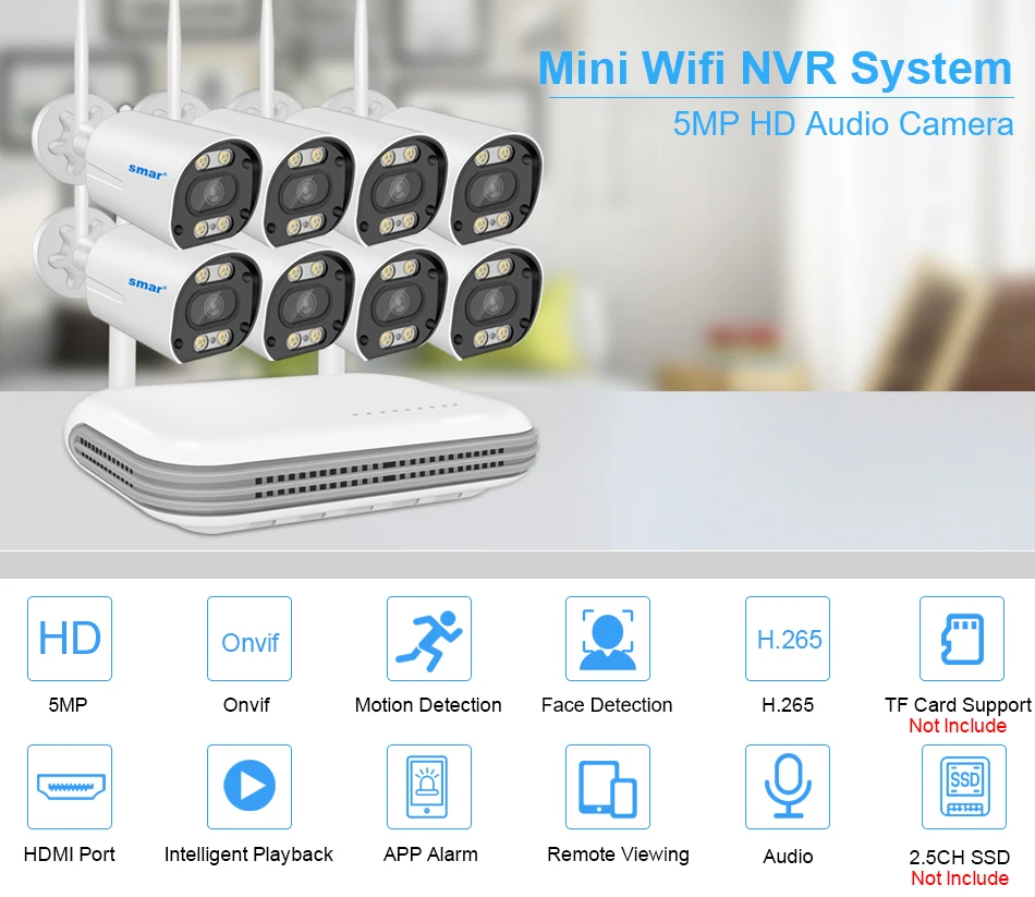 1. Камера поддерживает ультра-четкое разрешение 5 Мп;2. Комплект поддерживает обнаружение формы человека и распознавание лица;3. Поддержка h.265ai / h.265 + (Совместимость с h.265 / H.264) технология сжатия видео;4. Поддержка протокола onvif и доступ к сторонним/вечерние платформам;5. Камера имеет 4 шт. двойной светильник wick led и поддерживает три режима (дневное видение, ночное видение, полноцветное ночное видение), при обнаружении движения Включите полноцветный режим.6. Встроенные динамики и микрофоны камеры, двухсторонняя аудио функция;6. Мини NVR Поддержка Wifi/Проводная ip-камера, встроенный слот карты Micro SD, поддержка SSD порта, максимальная поддержка 128 Гб Micro SD карты и 8 ТБ 2,5 "HDD (опционально во время покупки)7. Новейшая технология каскадного WIFI идеально решает проблему ослабления и нестабильности сигнала Wi-Fi после больших расстояний и через стены;8. Подключи и работай, просто Подключите камеру и NVR к источнику питания и подключите NVR к маршрутизатору, что очень удобно;9. Комплект поддерживает циклическую запись 7x24 часов, запись движения и другие режимы записи, вы можете воспроизводить запись для просмотра;10. Поддержка веб-сайта, CMS, Центрального управления платформы программного обеспечения XMEYE;11. Технология Supprt Cloud, реализация проникновения сети, стыковки переднего и заднего конца, и информация о сигнале тревоги для мобильных телефонов