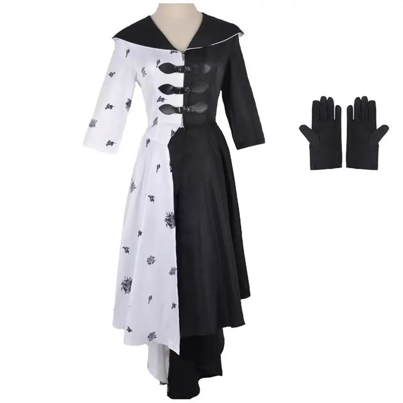 Костюм для косплея по мотивам фильма Cruella, модное черно-белое платье горничной с перчатками, парики для девочек, Женский костюм на Хэллоуин, костюм для вечеринки